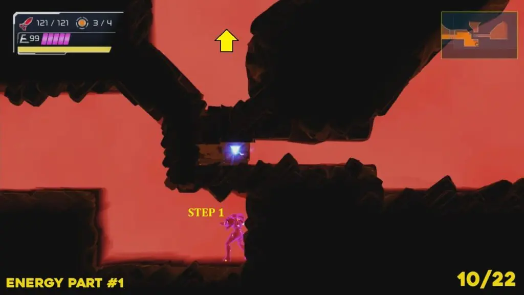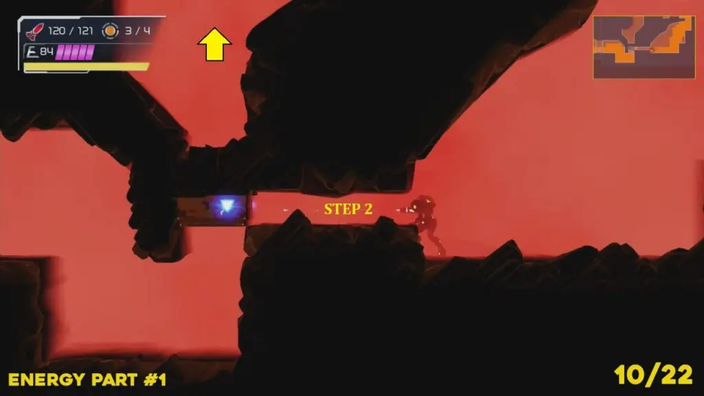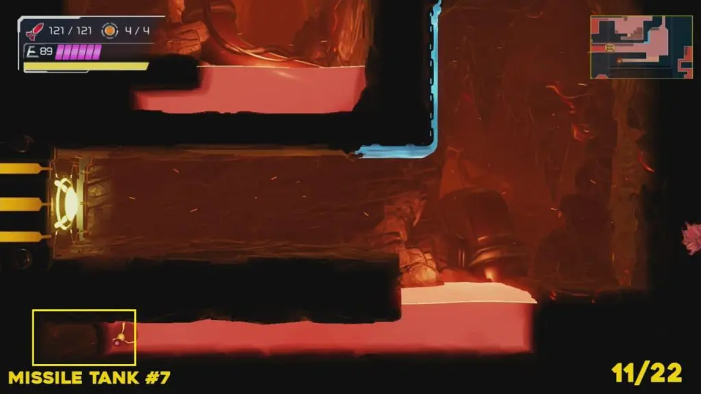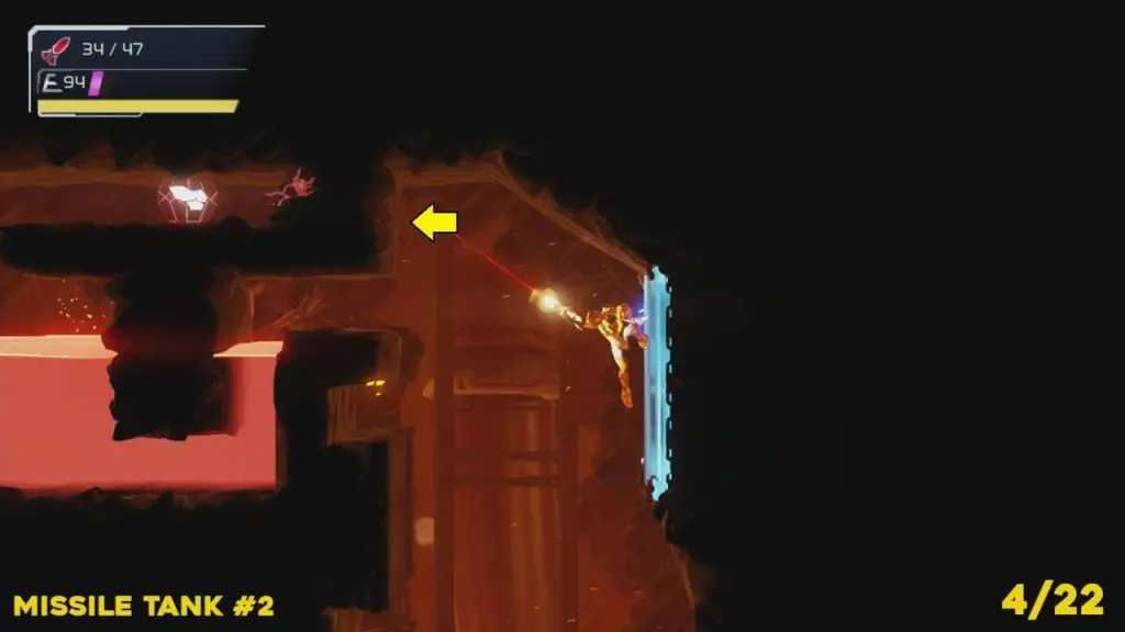 You’ll need your Varia suit for this missile tank. Head to the location to the marked location in the image. Blow the pieces of exploding wall out. Then spin jump up into the space exposed and roll into the next area to grab the missile