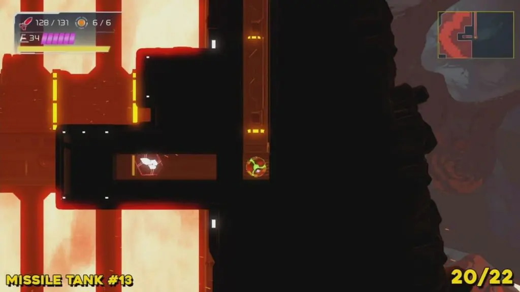 It required a Varia Suit for this next one. Once you’re at the Missile Tank location shown below you’ll need to slide through a small space to the left of your screen to enter the room containing it.