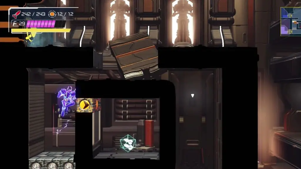 Samus running where you can see her in the map below, with the intent of ending up at the speed booster block to the left and below here that we’ve highlighted. Grapple Beam to break the block and then use Cross Bomb, which allows you to destroy additional blocks both horizontally and vertically. You will find a Missile Tank at the end.