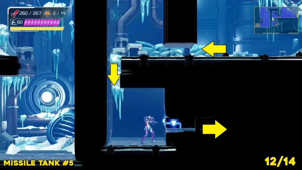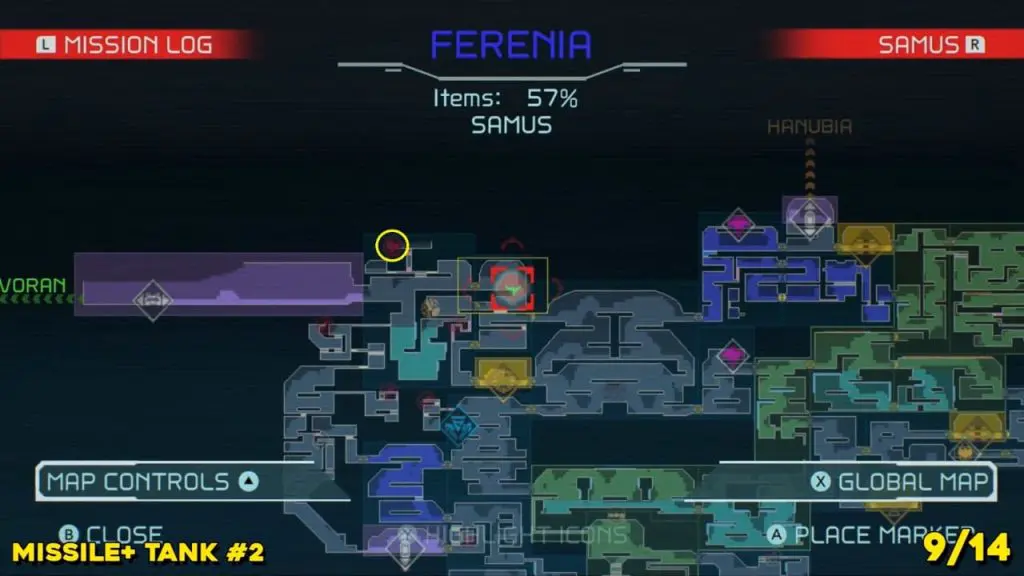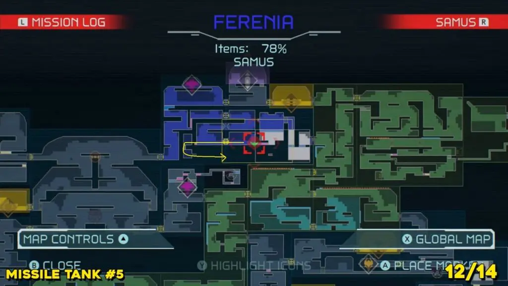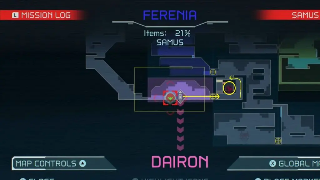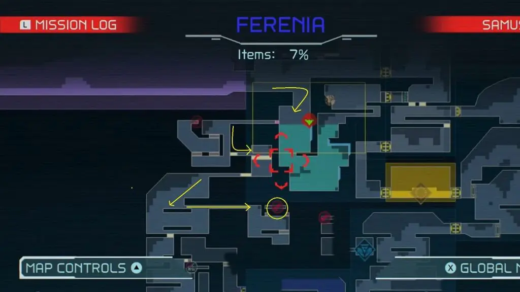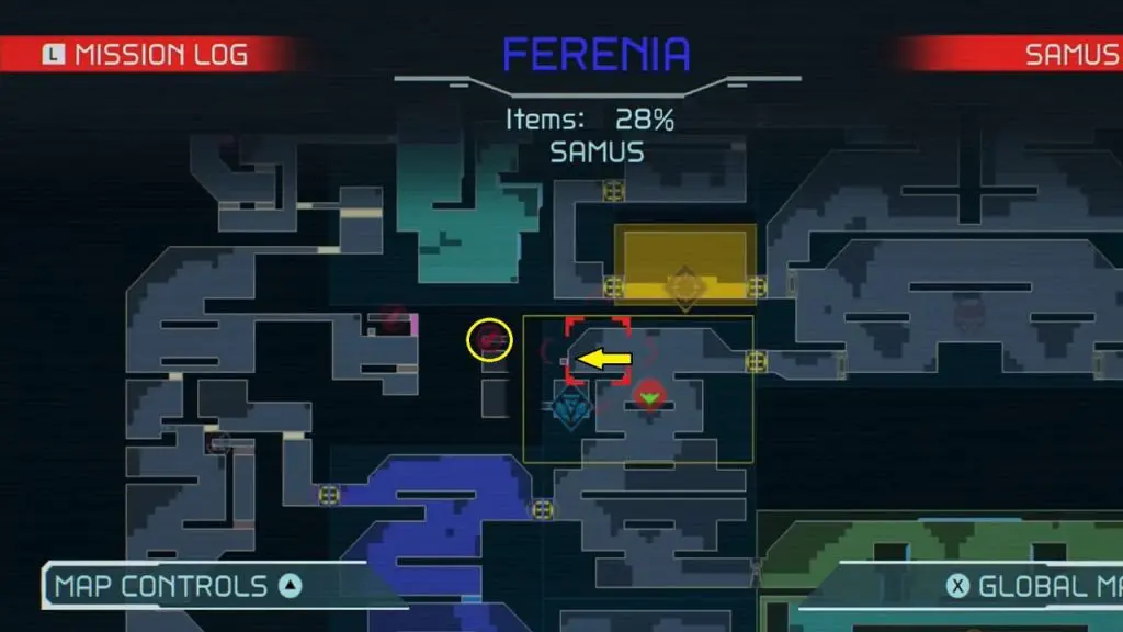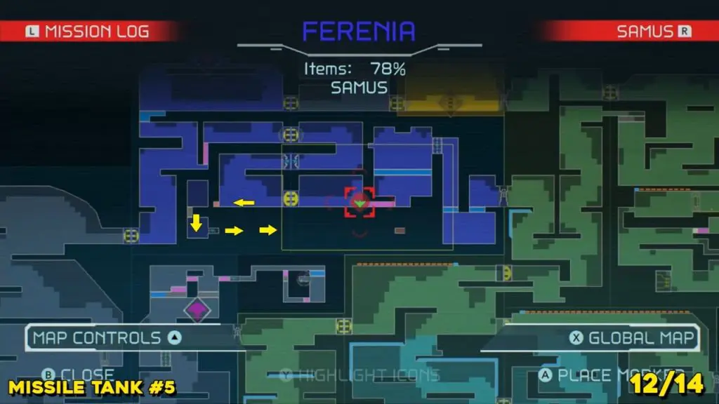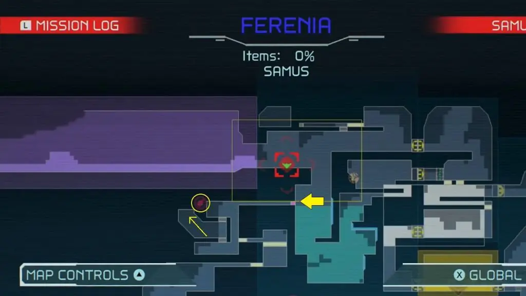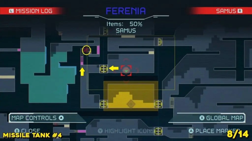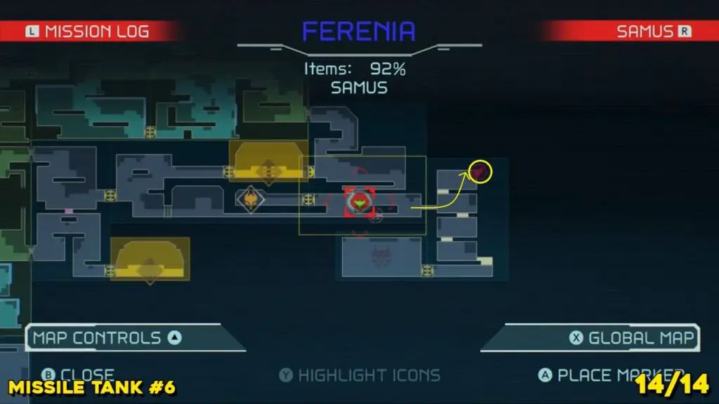 The last Missile Tank on Ferenia is found in the location on the map below, very near to where you will fight the area’s boss, Escue. Simply go there and fire a missile shot right up into the right-hand corner of the room as shown in the pic.