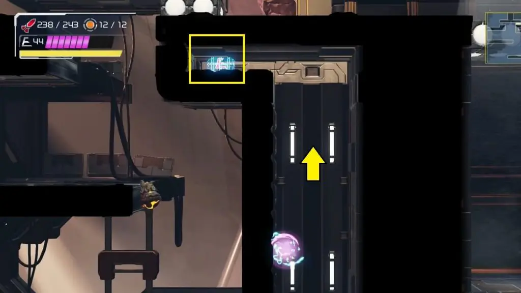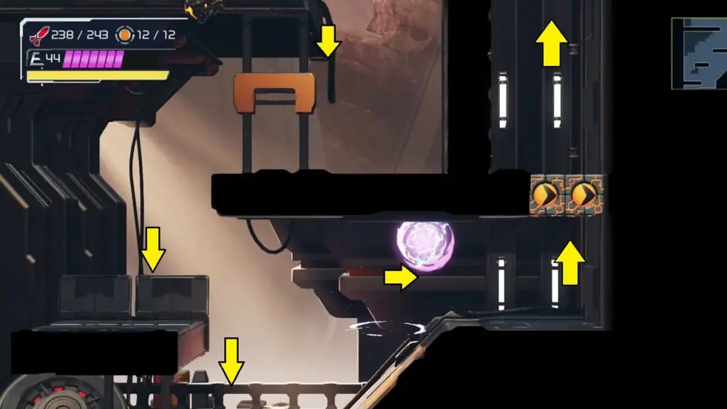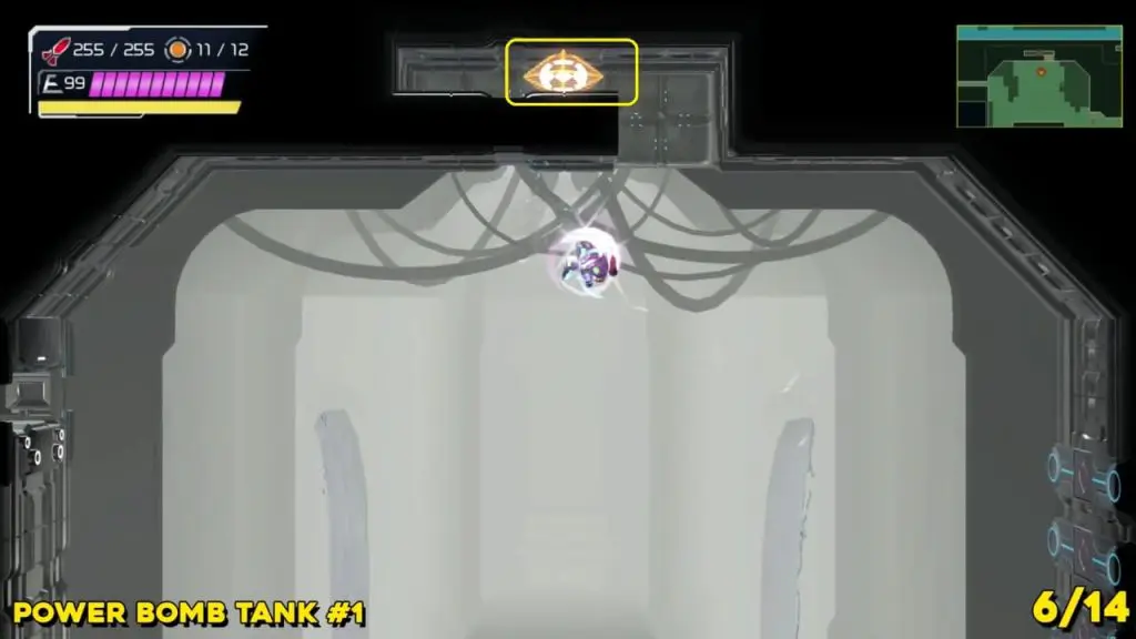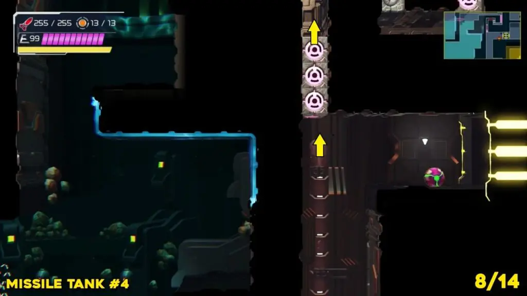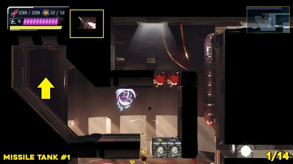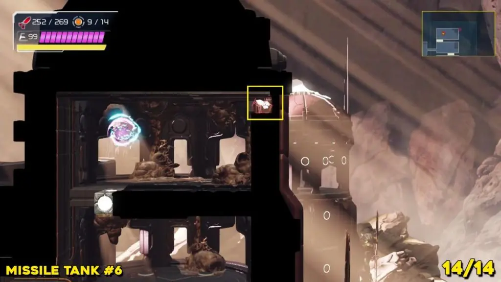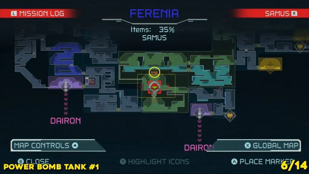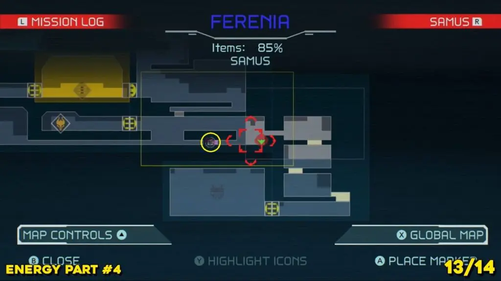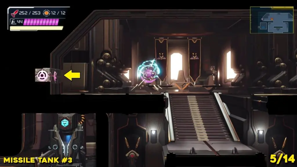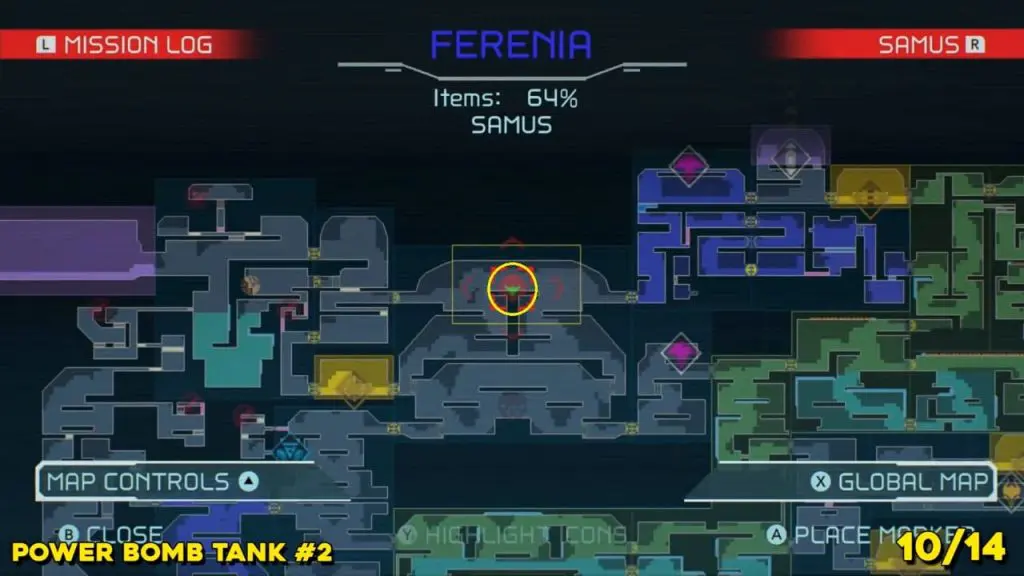 The last Missile Tank on Ferenia is found in the location on the map below, very near to where you will fight the area’s boss, Escue. Simply go there and fire a missile shot right up into the right-hand corner of the room as shown in the pic.