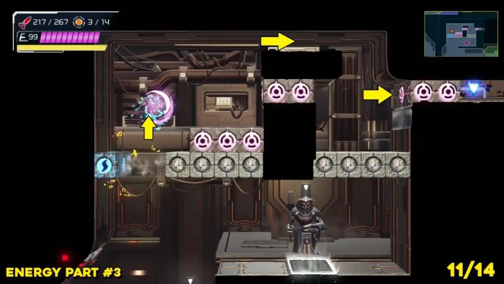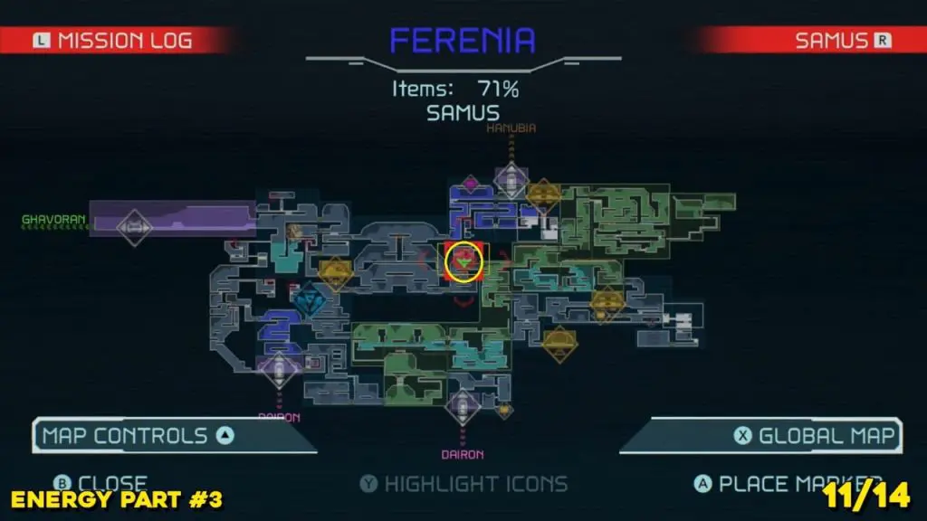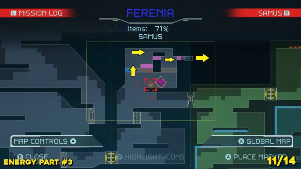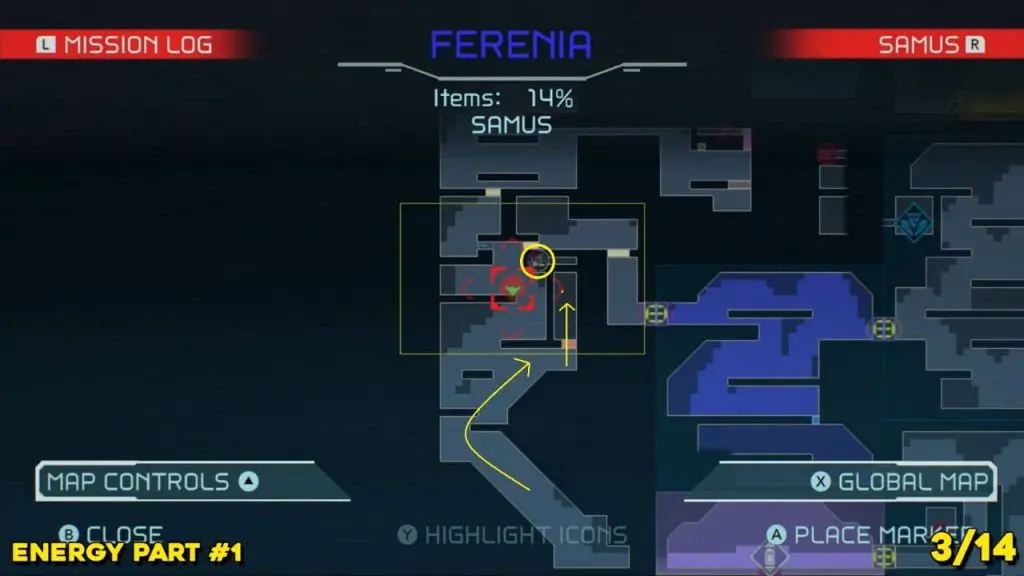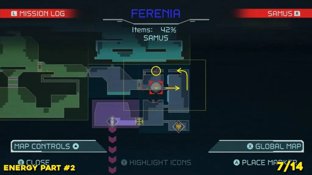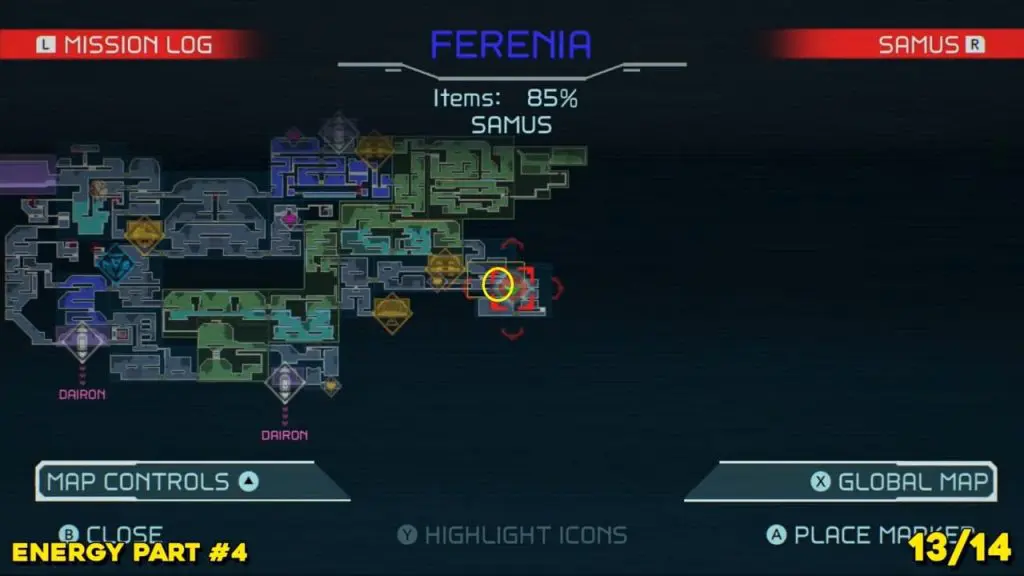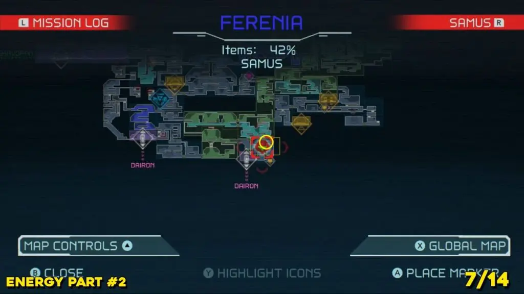 Energy Part is located to the right where you arrive from the Dairon elevator to the south. Check the map below and spin jump your way up into this little tunnel at the top of the room indicate in the map. Use Morph Ball Bomb to reach the Energy Part location.
