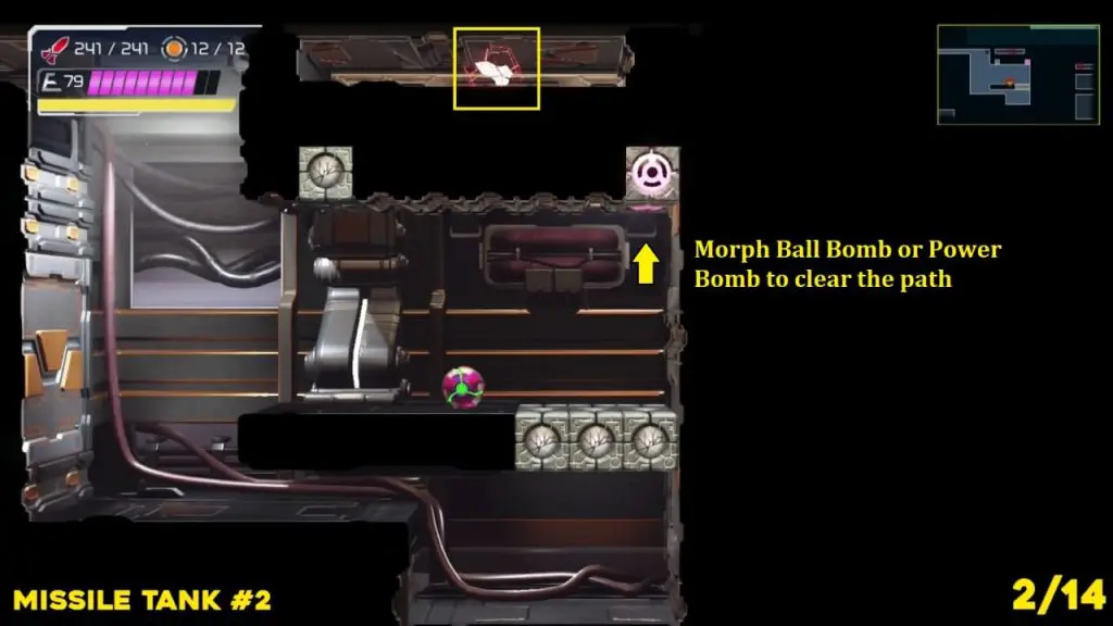 Head to the right from the last room where you find the previous Missile Tank. Enter the last room in the map below then drop to the platform underneath our missile tank. Use Morph Ball Bomb or Power Bomb the room so you can jump up, roll in and grab it.