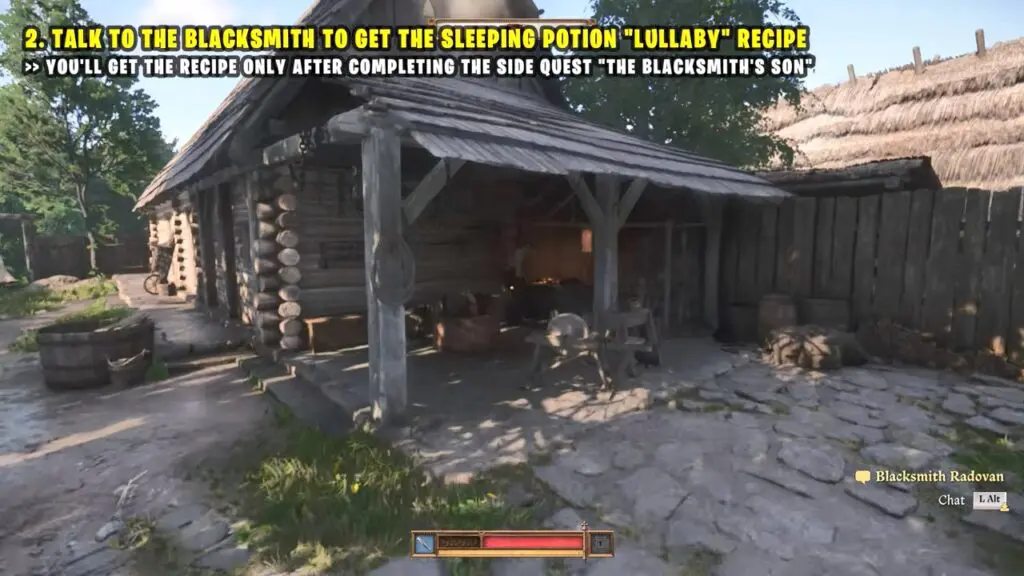To complete this task, you need to talk to the Blacksmith in Tachov. Find Blacksmith Radovan and ask him if he has anything that can calm animals down. He will give you the recipe for the sleeping potion Lullaby only if you have finished his first quest, “The Blacksmith’s Son”. This potion will help keep the bull calm.
