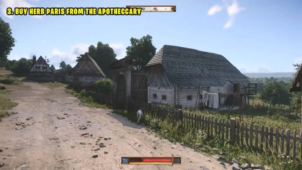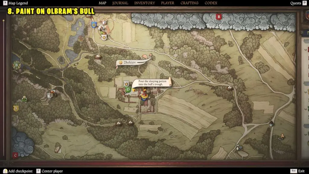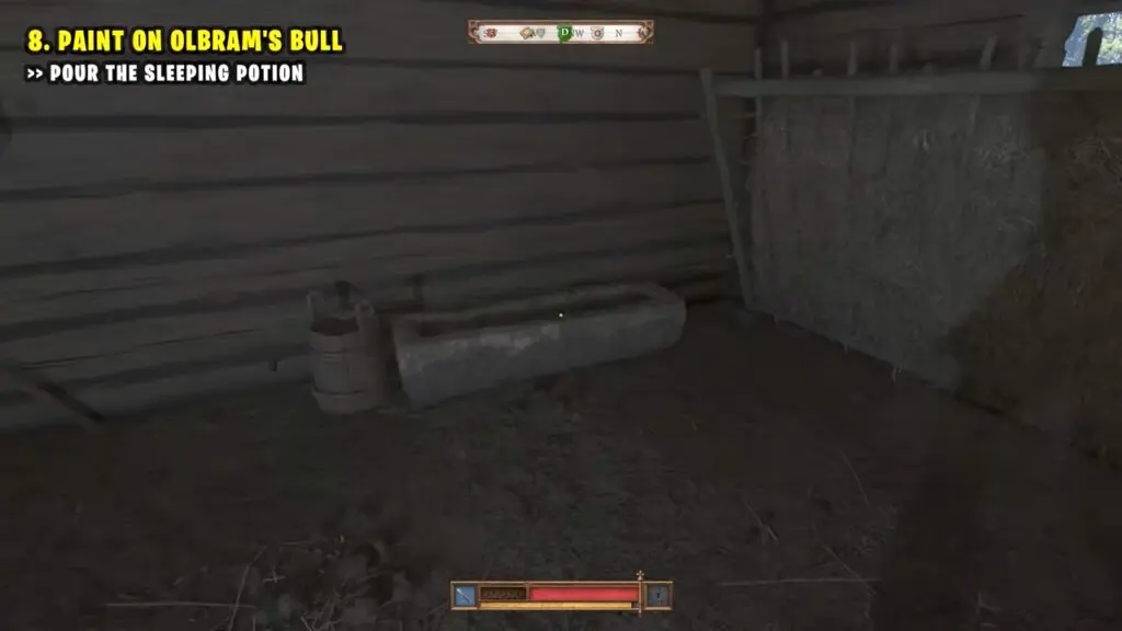 With all the items ready, head to Zhelejov and enter the barn. Find the feeding trough inside the barn and pour the Lullaby potion into it. Wait until nighttime when the bull falls asleep.