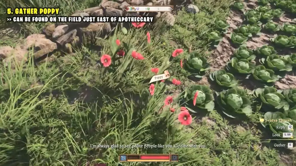 - 1x Poppy – It is a bright orange flower that grows along the roadside. One of the easiest locations is just east of the apothecary.