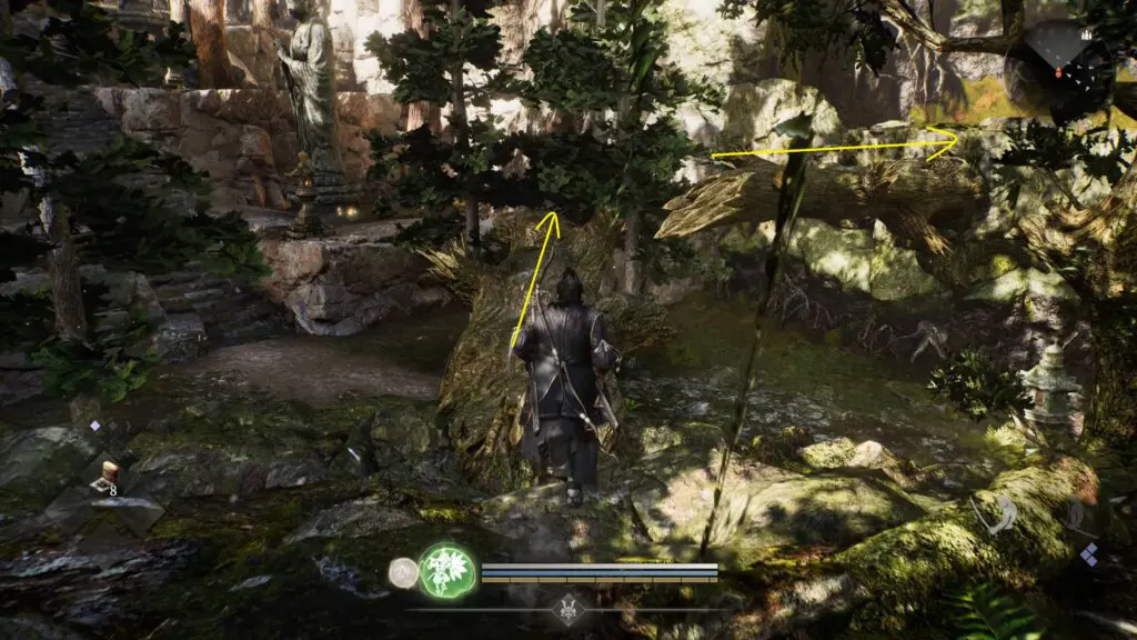 Step onto the tree trunk and move toward the right side. Keep following the connected tree trunks as they guide you forward. The path will curve and lead you back toward the left side of the main path.