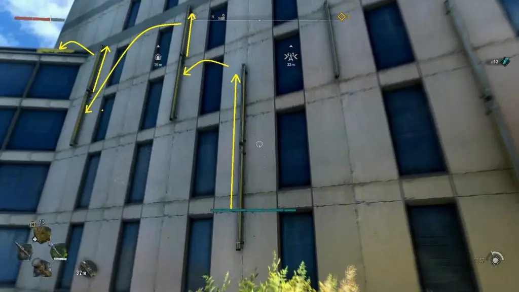 Then go straight ahead and climb the rails on the walls as shown below. On the wall ahead, you will see some poles. Climb the poles and keep jumping to the pole on the left side to reach the roof as shown below.