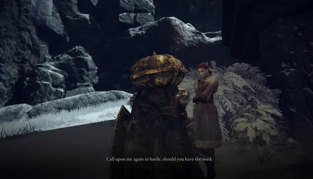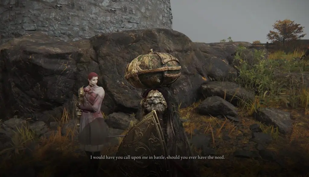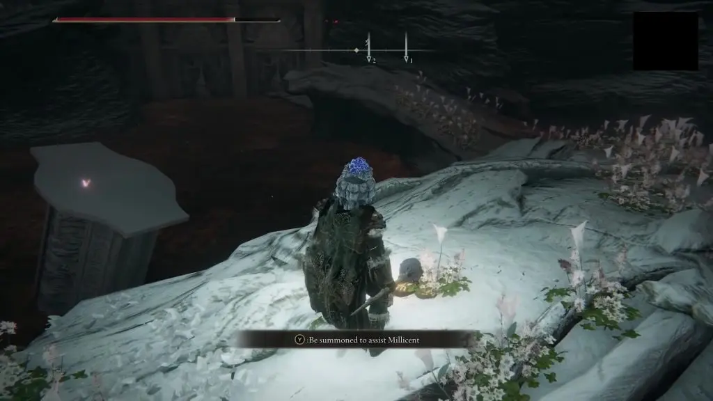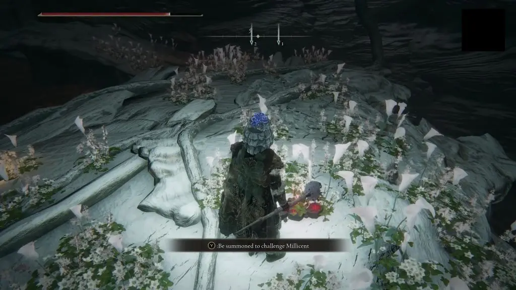 If you select the red summon symbol, you will go to another world, where you will have to fight and defeat Millicent. After the fight, you will get Millicent’s Prosthesis, which boosts dexterity and raises attack power with successive attacks. If you go back to Gowry, you will find him dead too. You will get Gowry’s bell Bearing and Flock’s Canvas Talisman from his body.