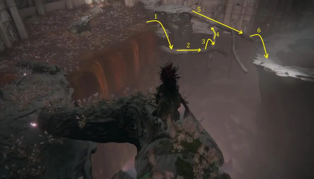 From the Elphael Inner Wall Site of Grace, walk down the stairs and then climb on the root going left. From there, go down by following the path shown in the picture below.