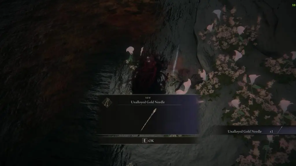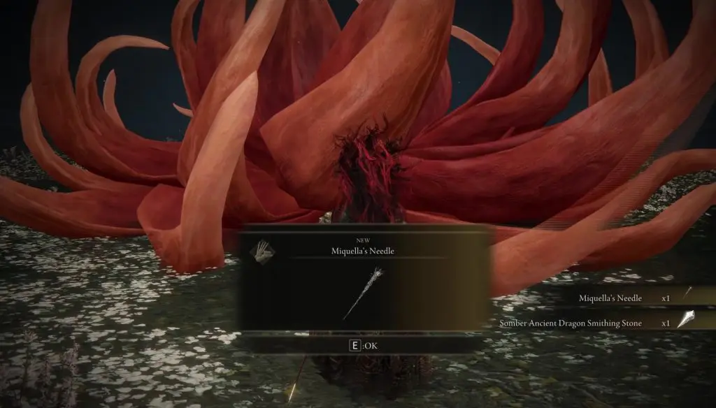 Proceed ahead in the Haligtree and make your way to the Haligtree Roots. Go down the stairs to reach the boss’s lair and defeat the Malenia boss. After she is defeated, a flower will appear in the boss area. Go near the flower and return the Unalloyed Gold Needle to get Miquella’s Needle as shown in the pictures below.