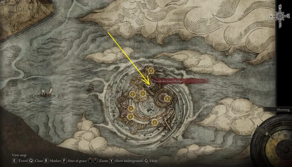 Now play the game and get branded by the Frenzied Flame, which leads to the bad ending (Lord of Frenzied Flame ending). Then go to the Crumbling Farum Azula and make your way to the Beside the Great Bridge Site of grace as shown below. Then take the elevator down.