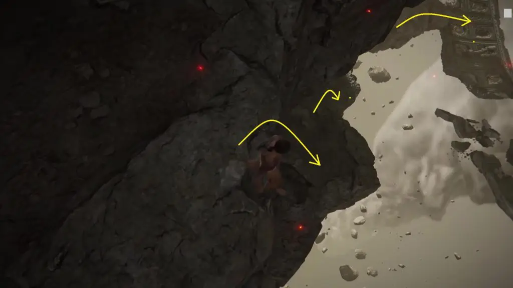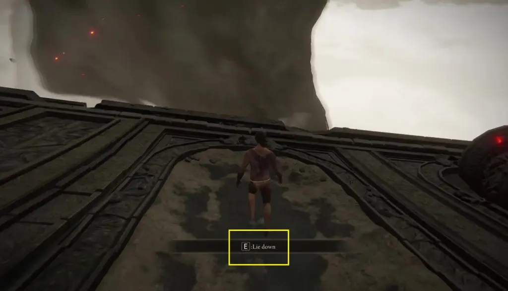 After coming out from the elevator, climb down the stairs and go ahead and come out from the western side of the building. Stand on the edge and jump down on the rocks to reach the floating structure as shown in the picture below. There you will get the option to “Lie Down” as shown in the second picture below. On lying down, you will reach Dragonlord Placidusax secret boss chamber.