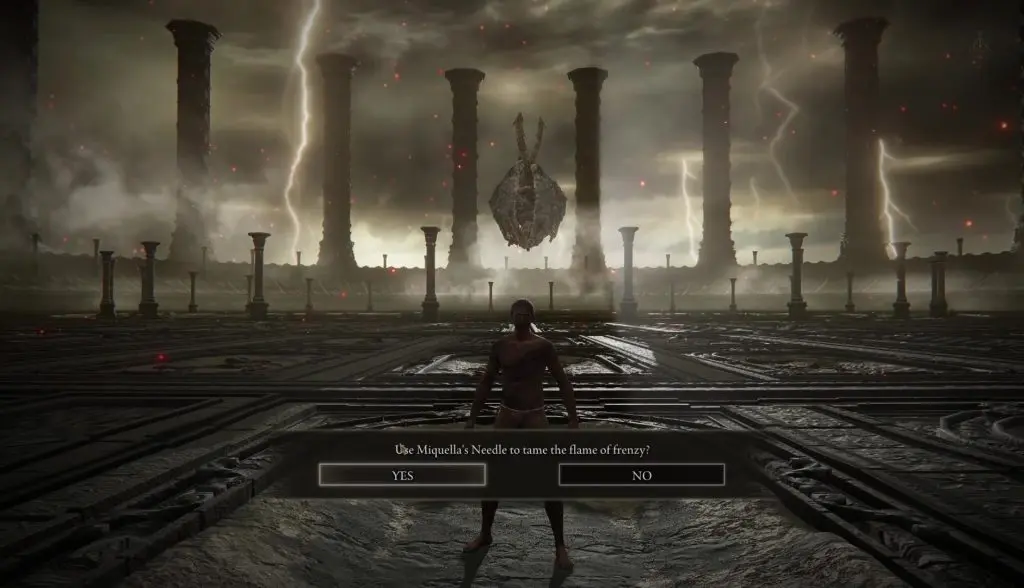 Use the Miquella’s Needle in Dragonlord Placidusax‘s chamber. You don’t need to defeat him, just open your inventory and use the needle to tame the fame of frenzy. Now you can finish the game normally and won’t get the bad ending.