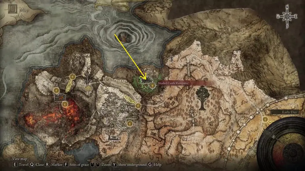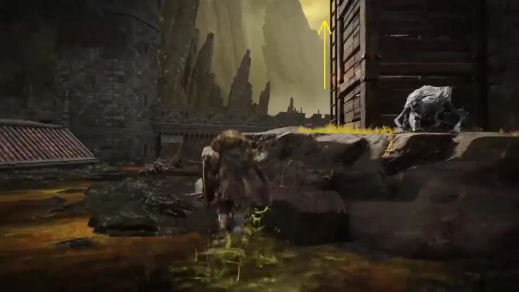 From the Shaded Castle Rampart Site of Grace, climb down the ladder to reach the castle compound. From there go west and climb up the ladder in the area where you will find some ruined houses as shown in the picture below.