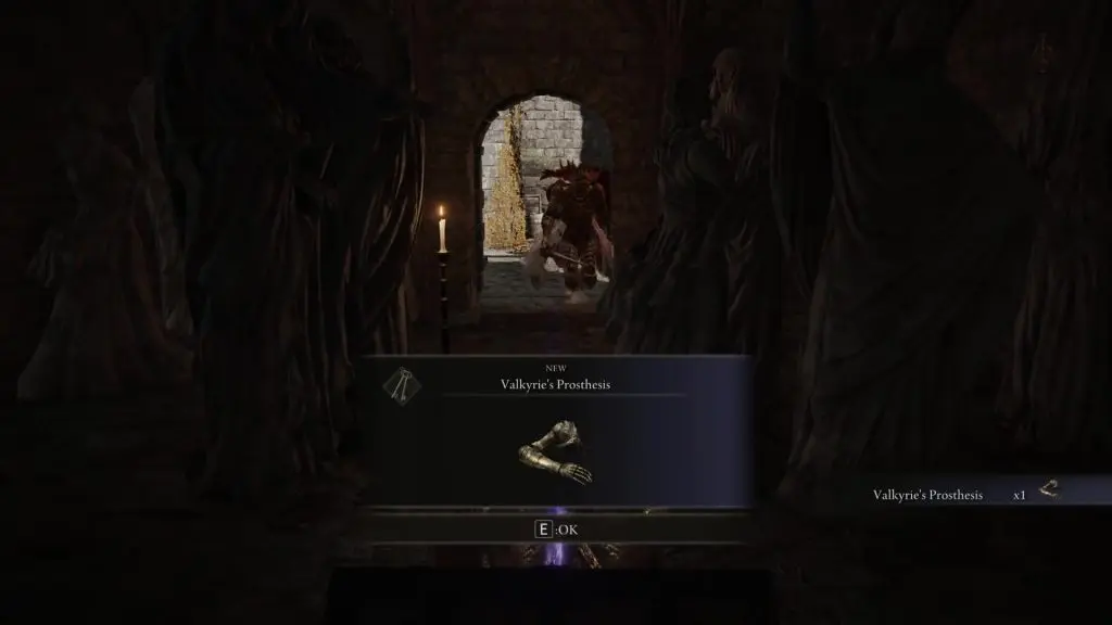 After climbing the ladder, go towards the northwest edge of the castle. Go inside the room at the corner and open the chest inside to get Valkyrie’s Prosthesis.