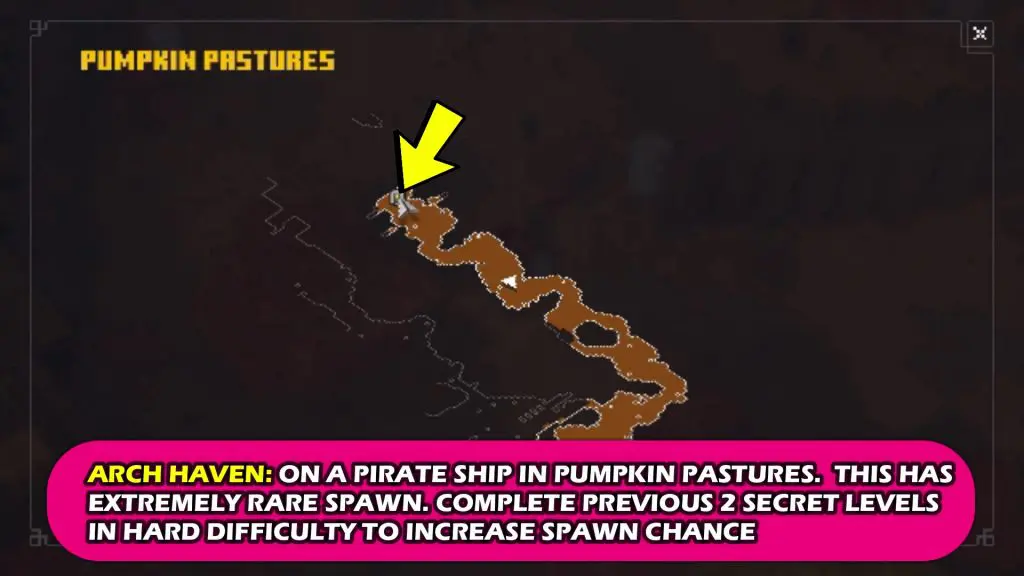 It can be unlocked on a pirate ship in Pumpkin Pastures. This entrance point has an extremely rare spawn chance. Complete previous 2 secret levels In hard difficulty to increase the spawn chance for the secret entrance to appear. Go through the secret entrance and defeat the enemies and then interact with the map to unlock Arch Haven Secret Mission.
