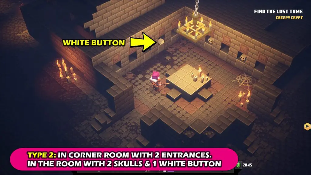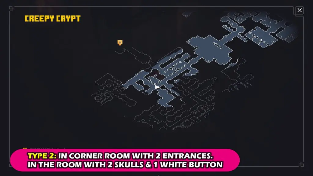 Second type of secret that you’ll find here is in a corner room with 2 entrances. There are many such corner rooms but they all will have 3 skulls on the wall. The room containing the secret will have 2 skulls and a white button on the wall. Press the white button to open the door and get the secret.