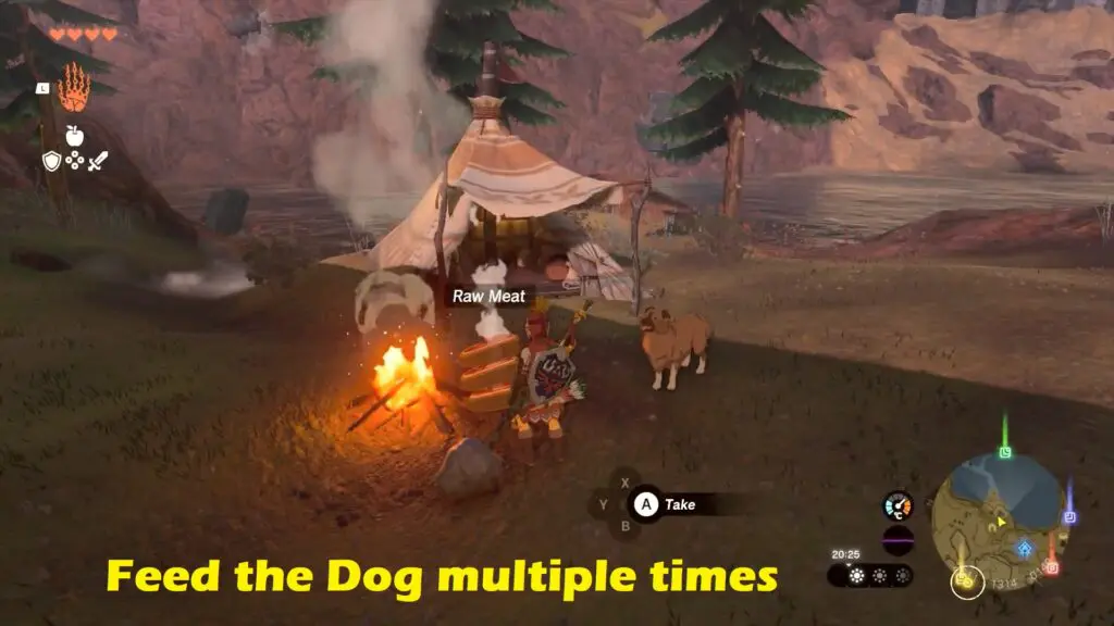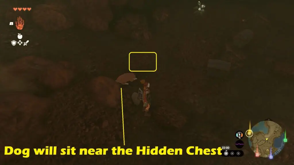 Once you begin the quest, you’ll notice a dog near the tent that will serve as your guide to the hidden chest. Offer food to the dog, such as fruits or meat, and continue doing so until the dog starts heading towards the cave.