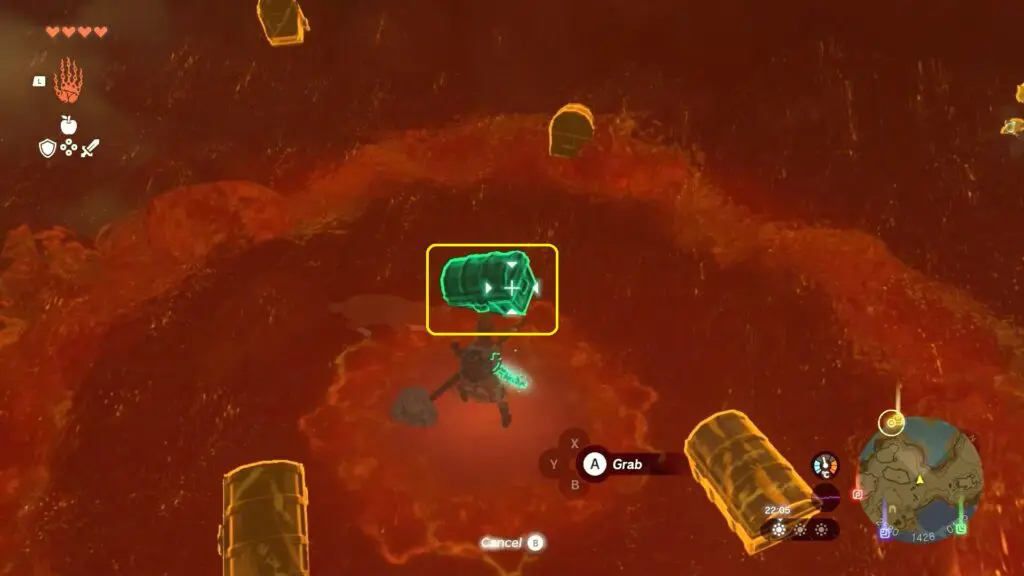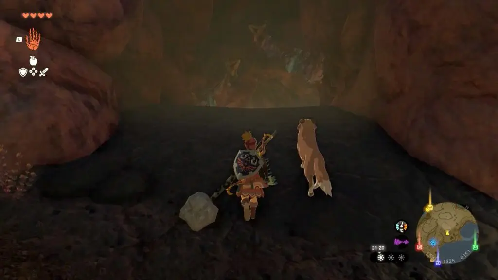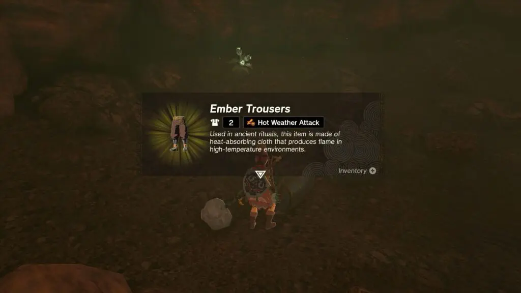 Use Ultrahand ability inside the cave to target a chest lodged in the wall or floor and shake the stick to free it. You can then open the chest and claim either the rupee or the clue inside. Upon searching several chests, you will acquire the Ember Trousers. The correct chest is located where the dog sits to indicate the location.