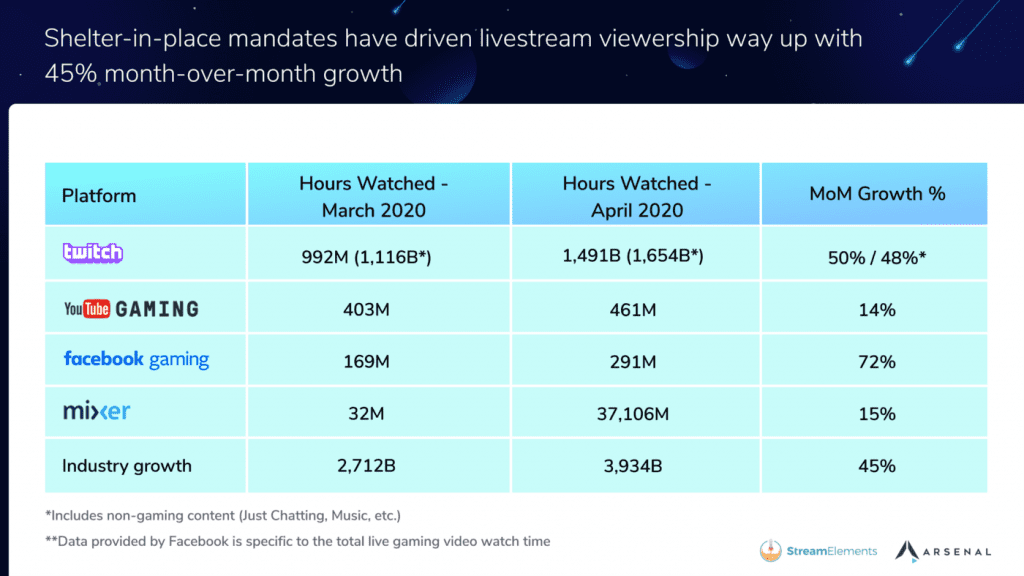 StreamElements and Arsenal.gg jointly published viewersip report of all the major livestreaming platforms showing year over year growth from April 2019 to April 2020.