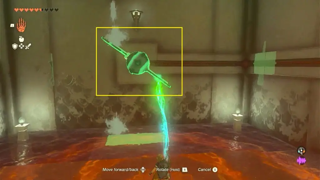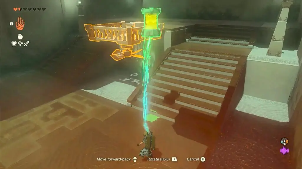 Now go back to the main area. Charge the power cell. Then grab it and climb up the elevator as shown in the picture below. Place the cell on the power station next to the elevator. This will take the elevator up. Get the Light of Blessing there to complete the shrine.