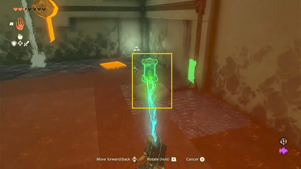 Now use the Untrahand ability to pick up the slab from the water and attach it to the rotating shaft next to the waterfall. Then rotate the shaft such that one of the slabs comes under the waterfall as shown in the picture below. This will make the shaft rotate infinitely, charging the power cell as shown in the second picture below.