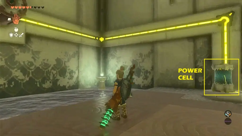 As you enter the shrine, you will see a battery cell on the ground as shown in the picture below. Grab it and place it on the charging station in front of the small waterfall on the right side as shown in the second picture below.