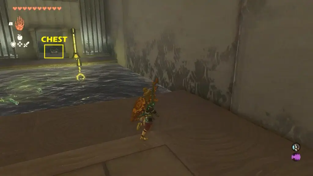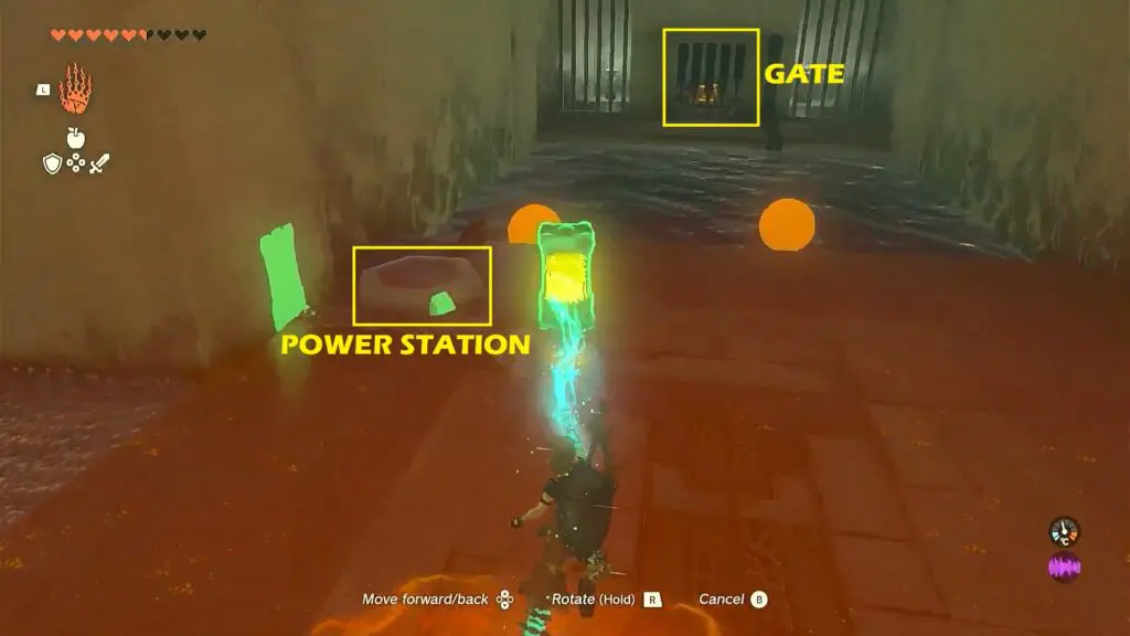 Grab the power cell and place it on the power station on the opposite side as shown in the picture below. Then use the Ultrahand ability to move the two spheres under the water closer as shown in the second picture below. This will complete the circuit, opening the iron gate on the opposite side as shown in the third picture below. Swim across from the right side, avoiding the charged area. Then open the chest to get Opal.