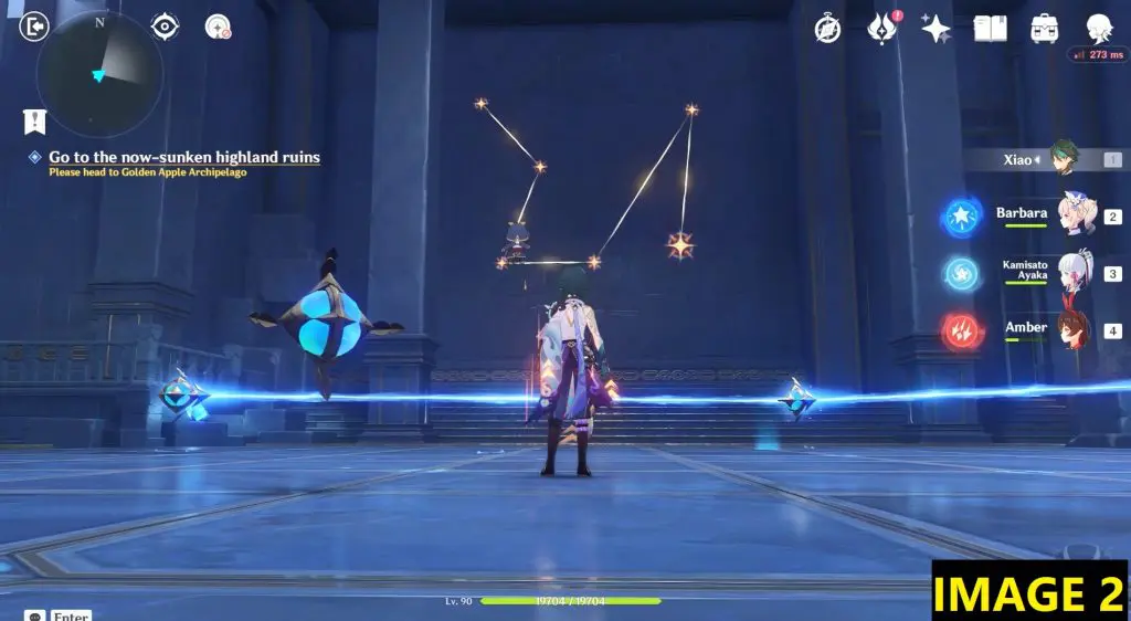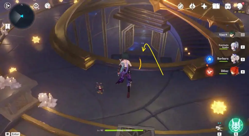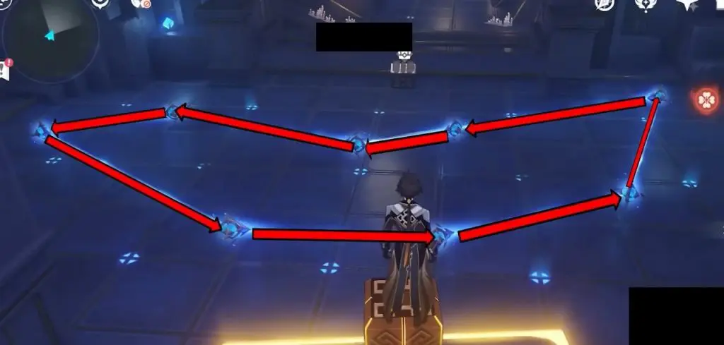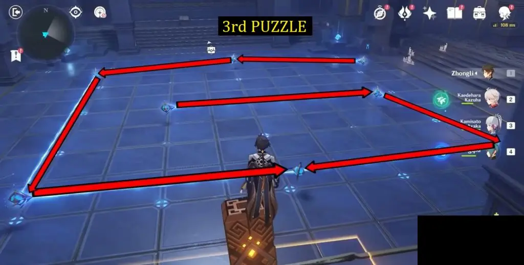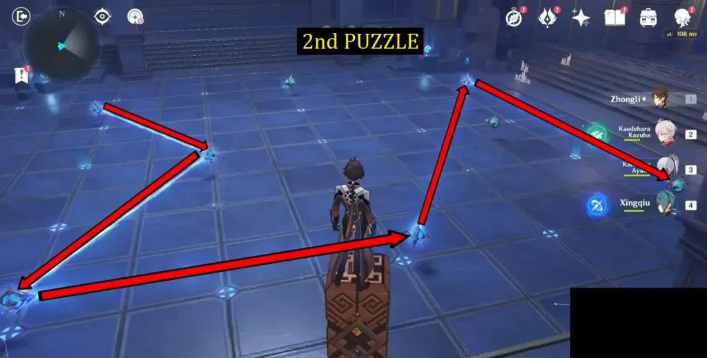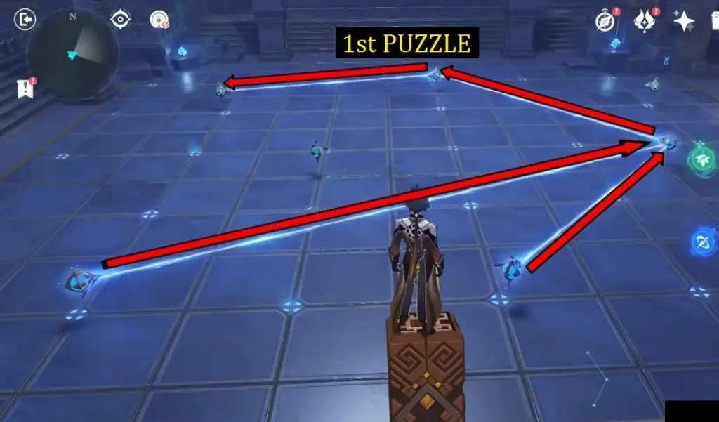 In the same room, you will see four circular switches on the floor. You will see a pattern drawn on the floor near the switches. To solve the puzzle, you need to step on the switches to form the same pattern in the sky. This can be done in 8 steps as shown in the picture below. I have named the switches A, B, C, and D for ease of explanation. On solving the puzzle, the precious chest in this room will unlock.