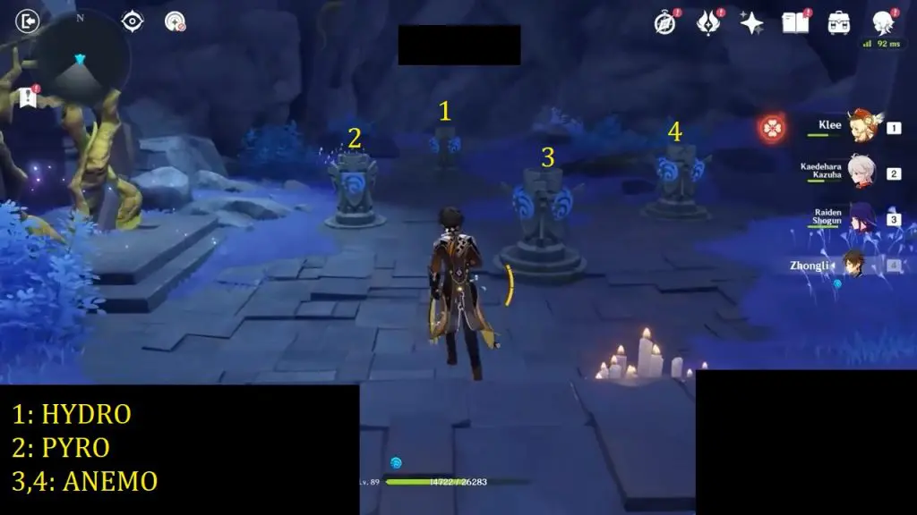 After opening the previous chest, climb up the stairs and walk through the wall to reach the next chamber. Here you will see 4 hydro totems. Only one of these totems is actually hydro. The rest of the three totems are fake. Totem #1 in the picture below is the real hydro totem. Activate the hydro totem, which will make water fall on the ground. In the reflection on the water, you will be able to see the real elements of the other 3 totems. Totem #2 in the picture below is Pyro. Totem #3,4 are Anemo. Activating all the elemental totems will make an exquisite chest spawn.