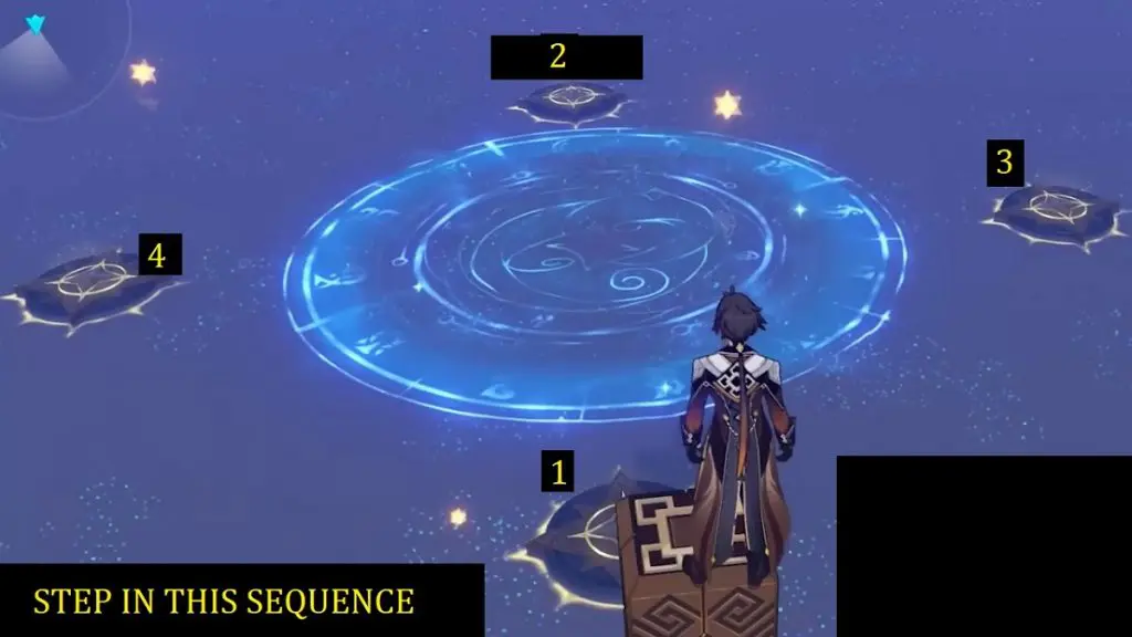 You will see four switches here and some patterns in the sky. Your objective here is to make the patterns in the sky disappear. To do so, step on the switches in the sequence shown below. After that enter the portal and you will find the Luxurious chest in front of the pool in the Mona Domain.