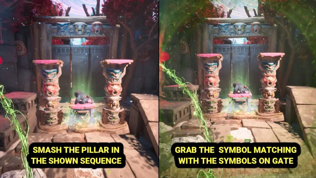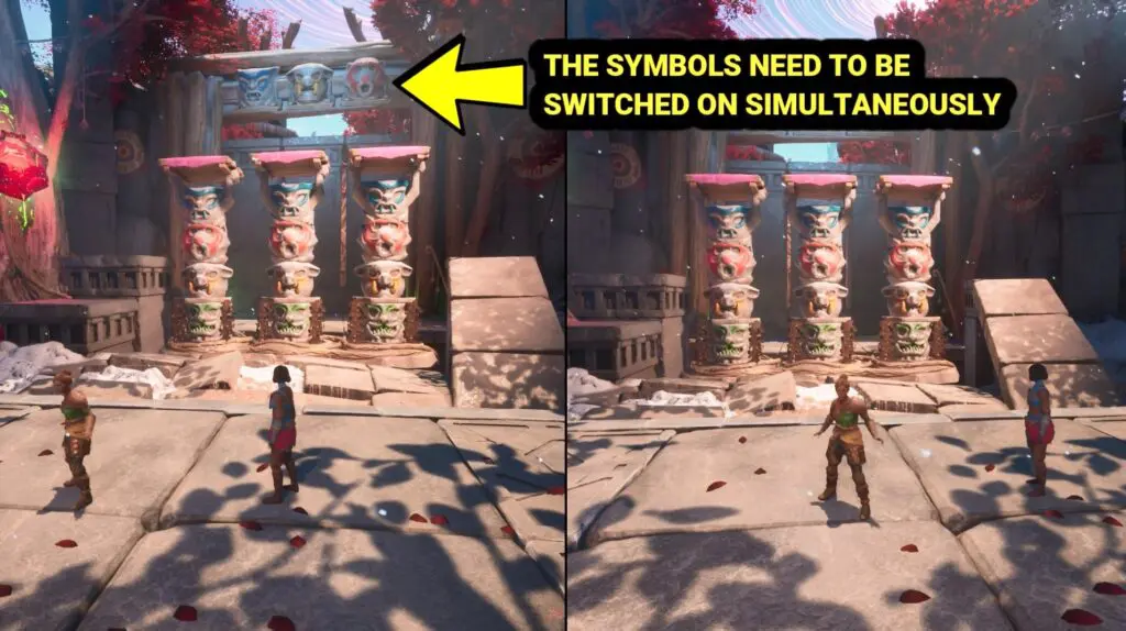 To open the gate, they must solve a puzzle by pressing the correct totems that match the symbols above the entrance.