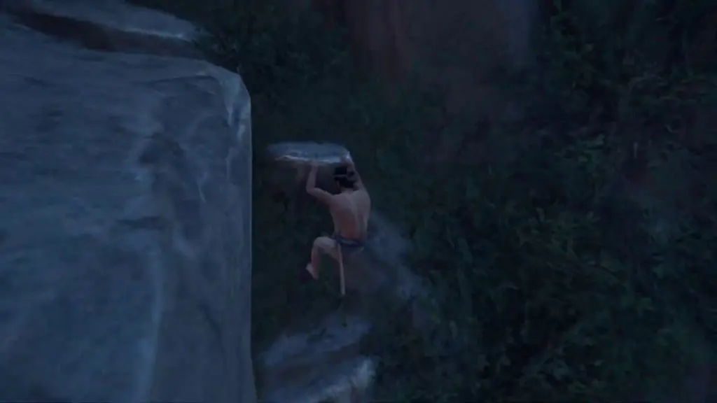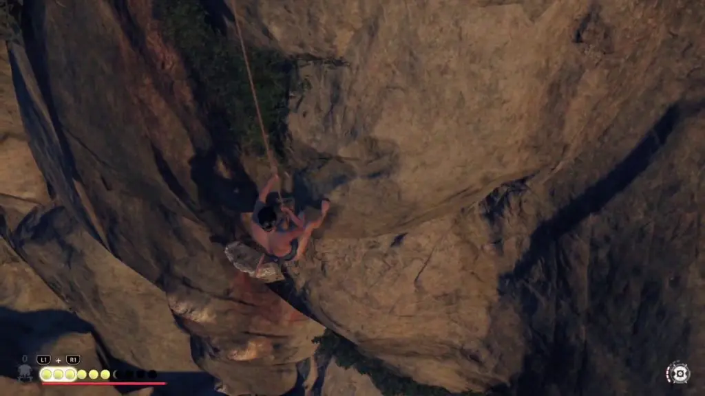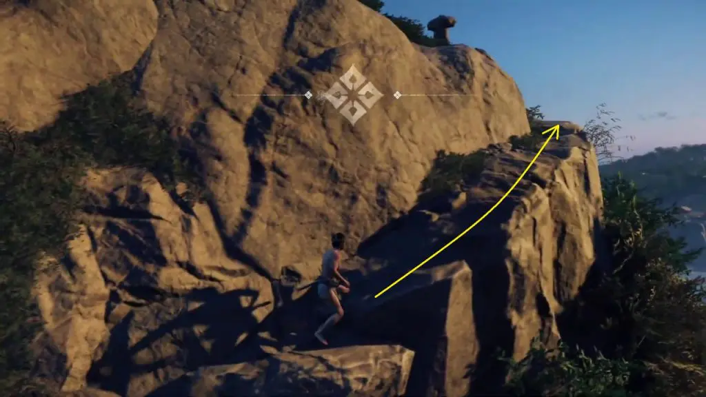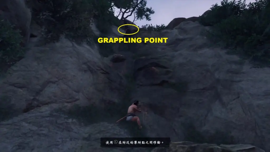 From here keep climbing until you see a grappling point. Use the grappling point to climb further up until you reach a small platform on the mountain.