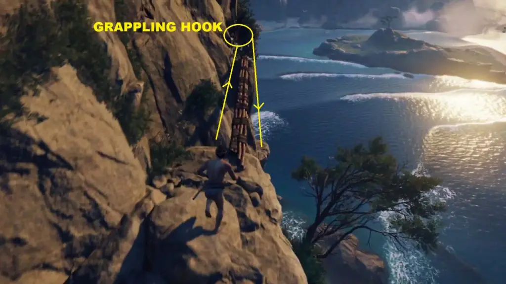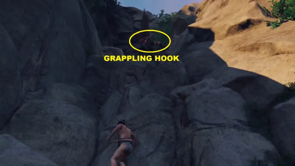 A little ahead on the path climb up the rocks using the grappling hook.
