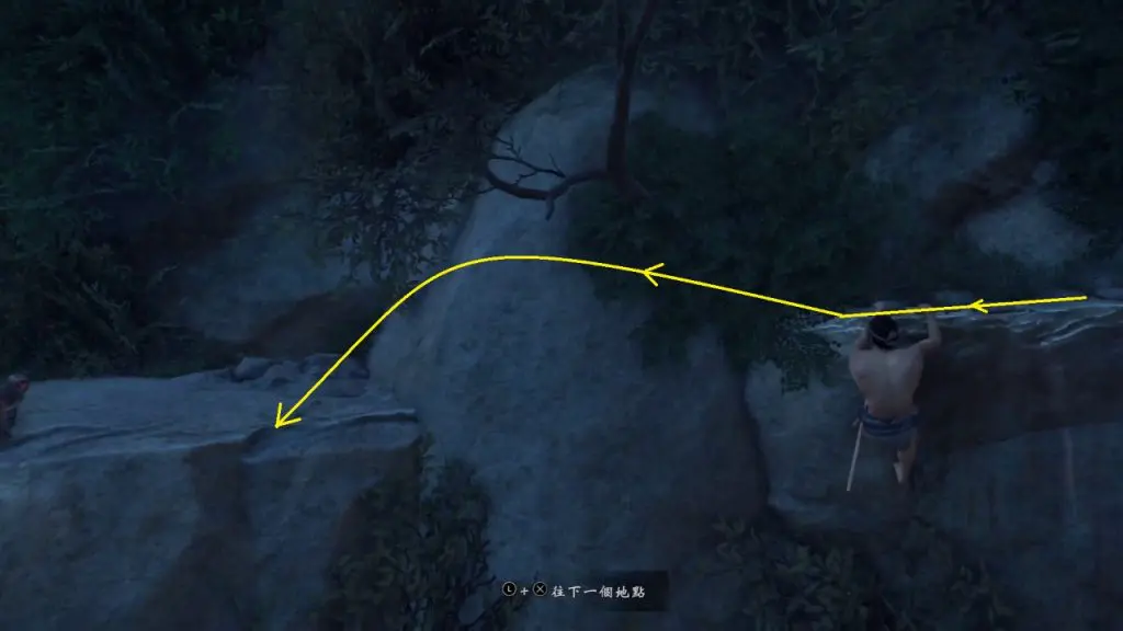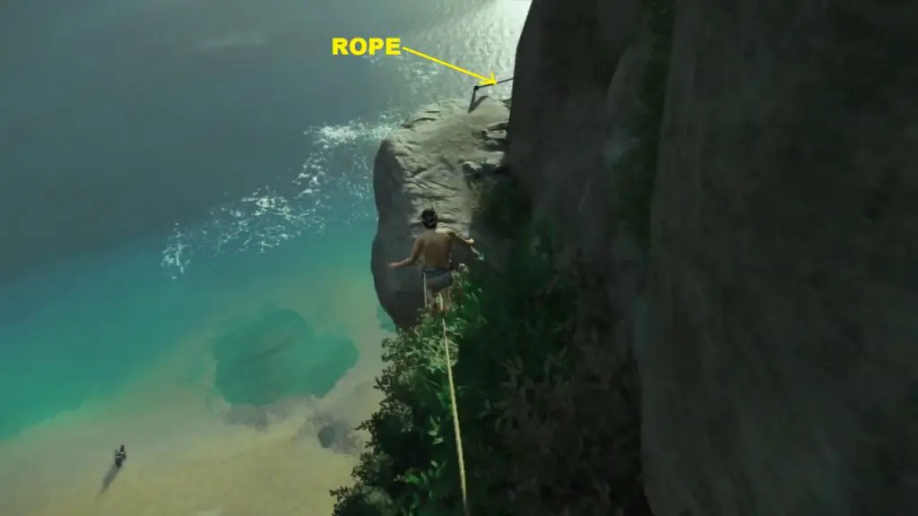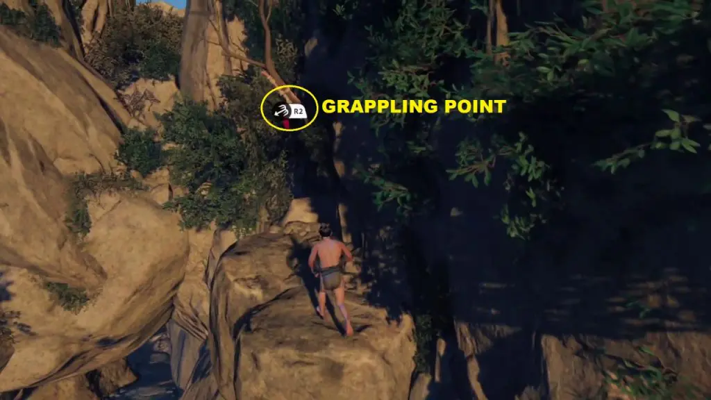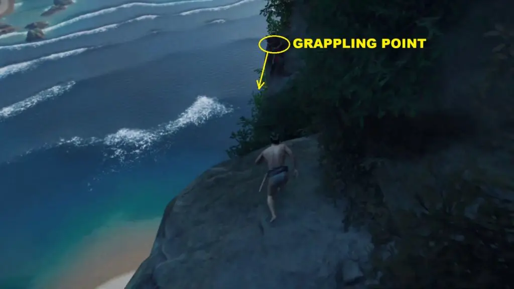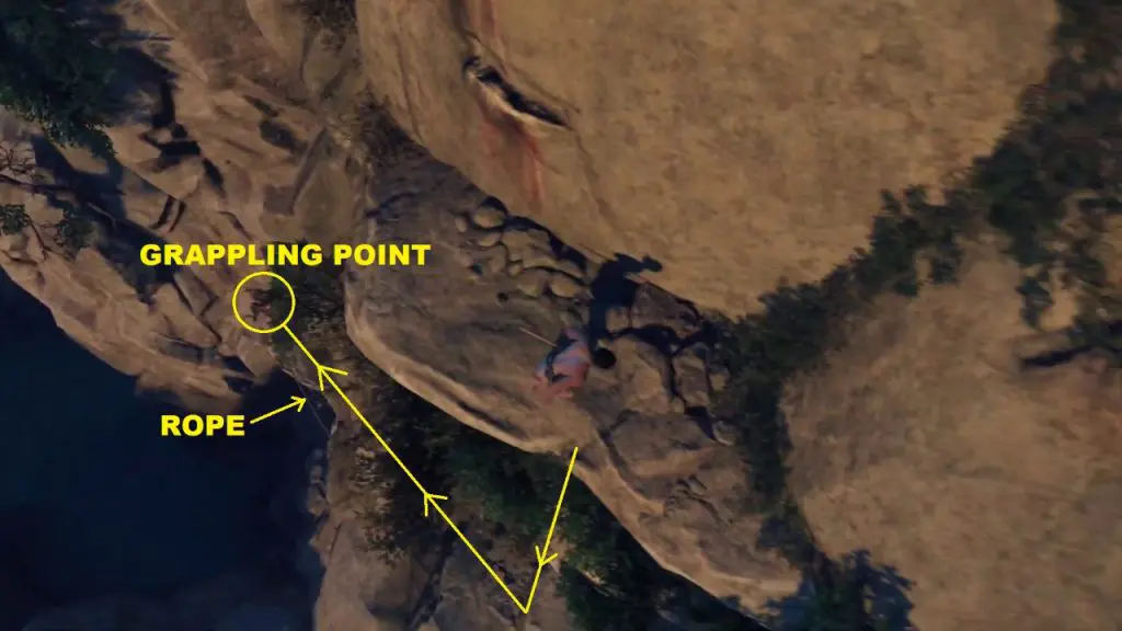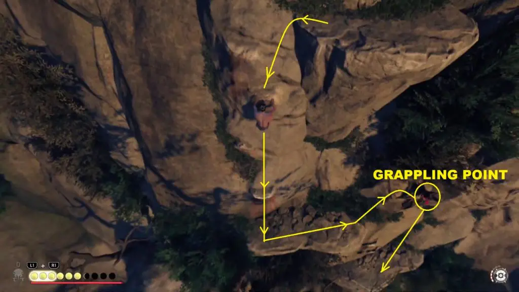 From the above-mentioned platform, drop down to another platform on the mountain. Here you will find a grappling point on the right side. use it to drop further down as shown in the pictures below.