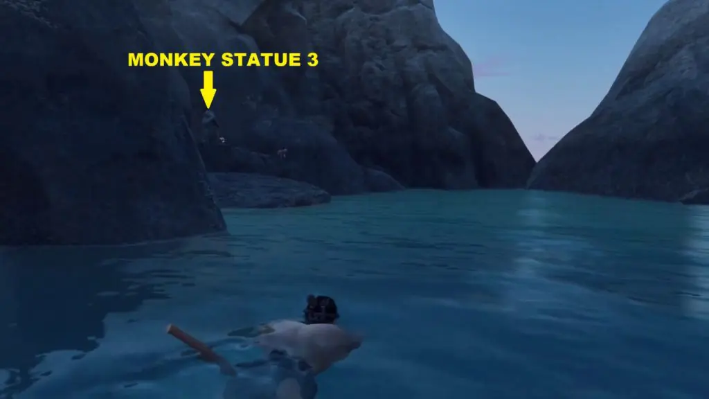 Use the grappling point mentioned above, to jump down. From there jump into the water and swim ahead to reach the third money statue ( Monkey with Mouth Covered) as shown in the pictures below.