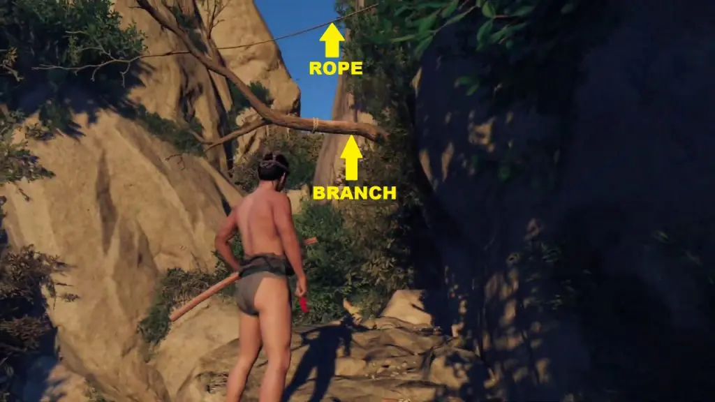 Climb the rope. Then jump and pass through the small gap on the mountain wall.
