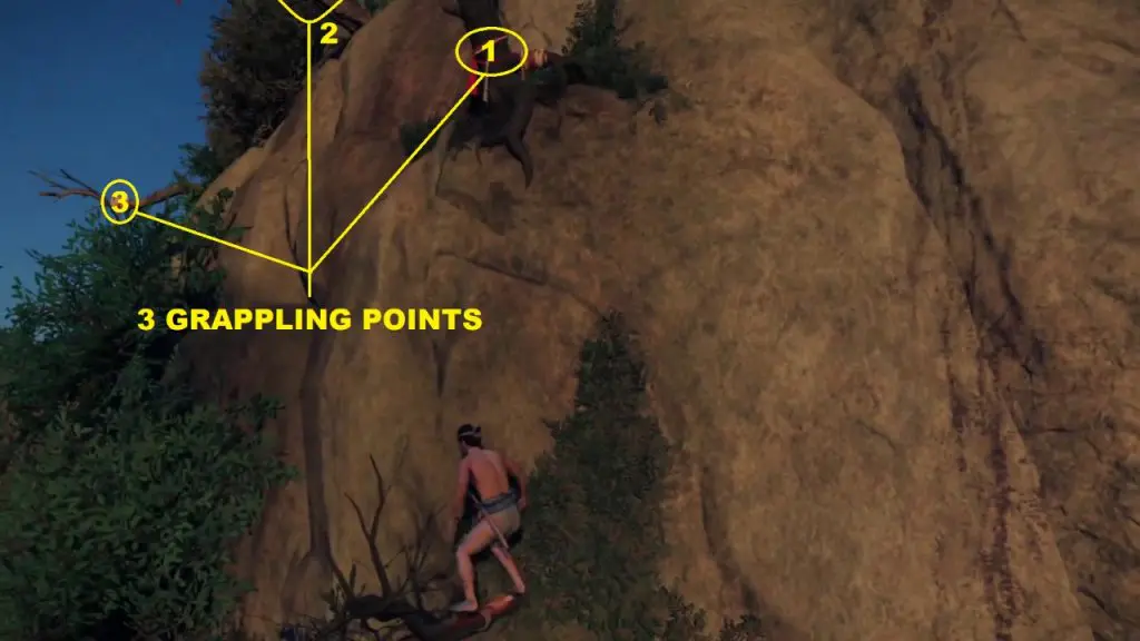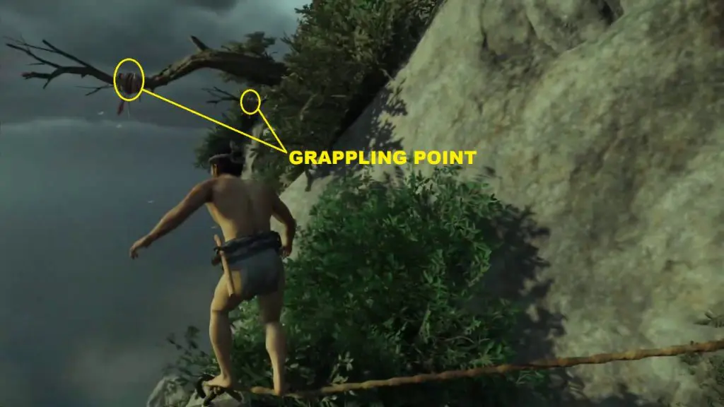 Climb up the horizontal branch. Here you can see three grappling points. Use your grappling hook to jump across to the platform ahead.