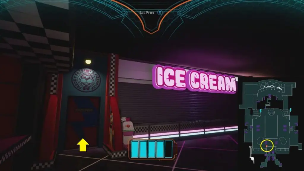 Follow the hallway and then take a right, cross two doors to reach the Trash Compactor location as marked on the map. Get out of Freddy’s suit and Place the Monty Mystery Mix in the Trash Compactor