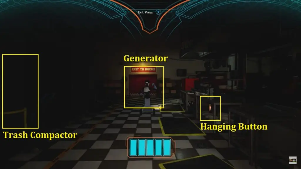 Now, go to the storage room in the back-left door of the Kitchen to switch ON the Generator. At this moment Chica will start chasing you. Sprint back to the Trash Compactor in the kitchen and hide near a metal table. A cut scene starts playing where Chia starts eating the Pizza from the Trash Compactor. Press the button hanging button to crush Chia inside the Trash Compactor. Here Greg also gets pulled down along with Chica