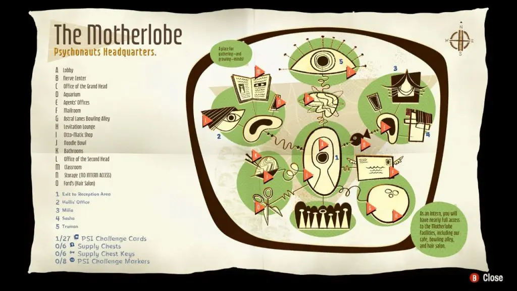 The PSI Challenge Markers can be found in the Nerve Centre section of the motherlode. When you reach the main hall, take the elevator with the brain logo on the left and ride it up with your levitational balloon. You will be directed to the Grand Head’s office. PSI Challenge Markers can be found in Truman’s office, inside the locker door to the left. Truman will grant you access to this door.