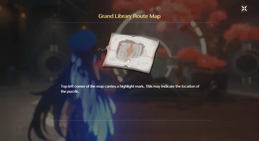 To solve the puzzle, open the Grand Library Route Map and see the clue as shown in the picture below. The clue mentions that the Top Left corner of the map carries a highlight mark. This may indicate the location of the puzzle.