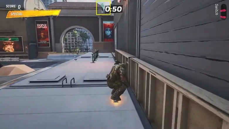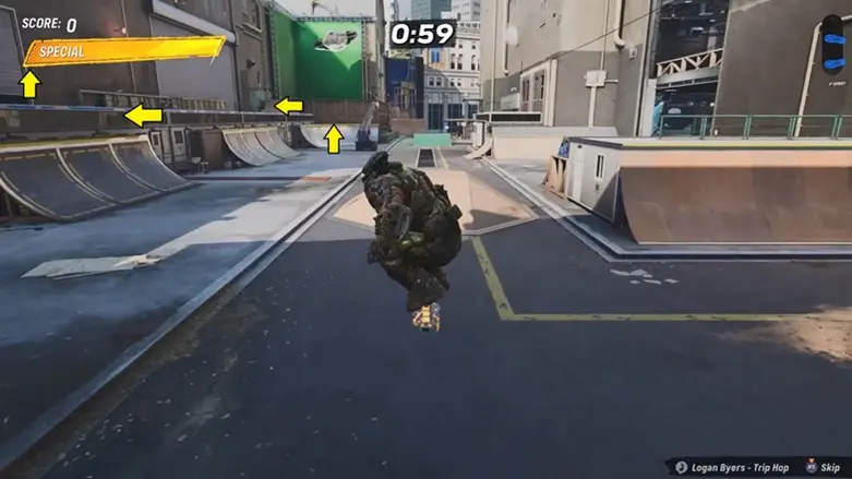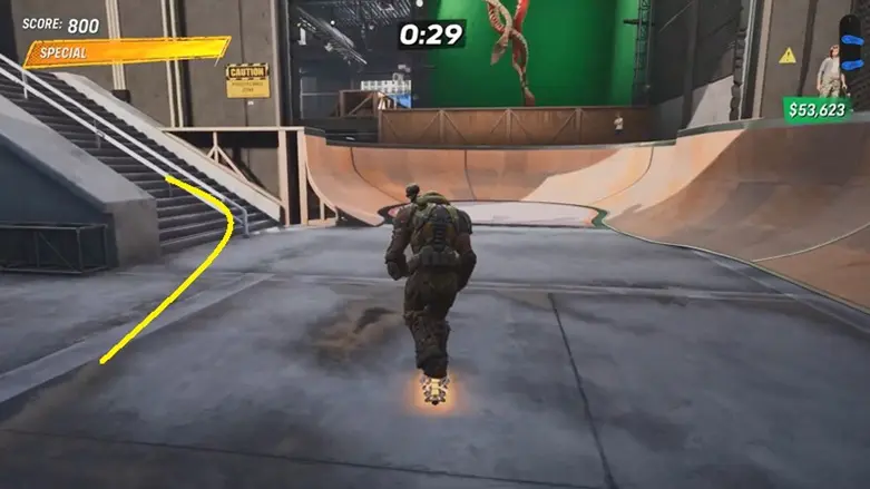 From the starting location, go straight ahead and use the quarter pipe near the green screen to launch yourself onto the platform above.