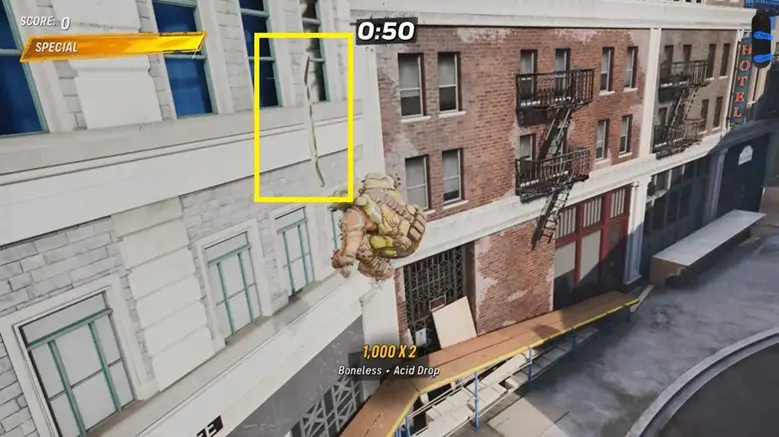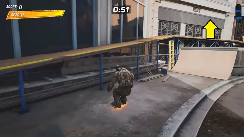 From the starting location, head straight until you spot a quarter pipe next to some scaffolding and a building labeled CAFE. Use the quarter pipe to build up momentum and launch into the air. Aim carefully to reach the Hidden Deck floating above the area.