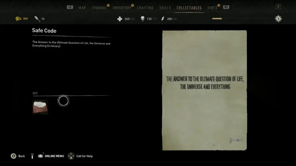This riddle is the Easter Egg to “The Hitchhiker’s Guide to the Galaxy”. As per the book, the “Answer to the Ultimate Question of Life, the Universe, and Everything,” calculated by an enormous supercomputer is the Number 42. Number 42 in Binary form is 101010. So, the safe code is 10-10-10. Enter the code to open the safe. Inside the safe, you will find a mine and a duckie.