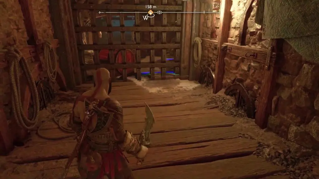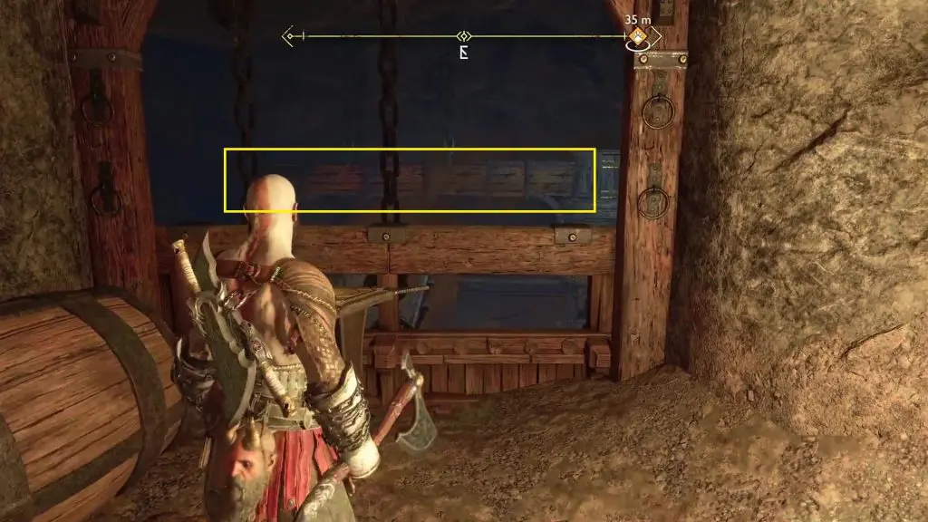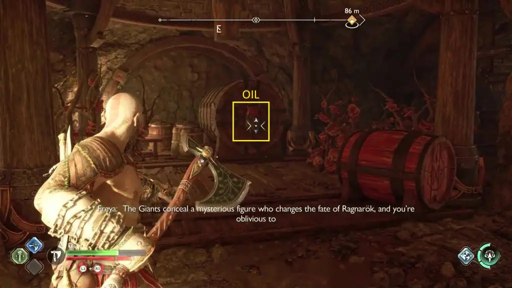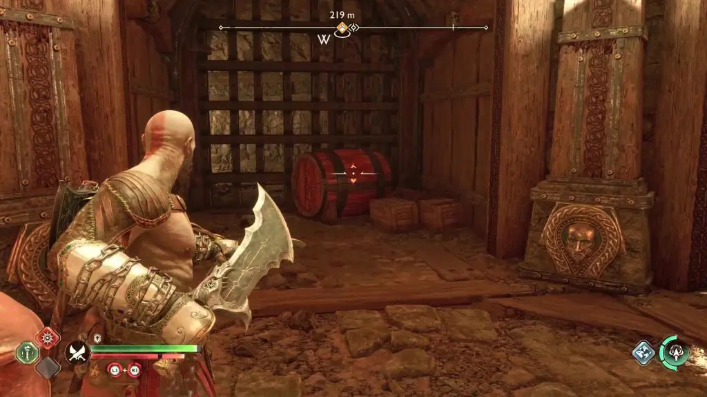 Proceed ahead and you will reach a gate puzzle. On the opposite side of the gate, you will see an oil barrel as shown in the picture below. Hit it with your axe to spill some oil. Hit the oil with your blade to create an explosion, burning the red vines. This will clear the path for you to reach the legendary chest.