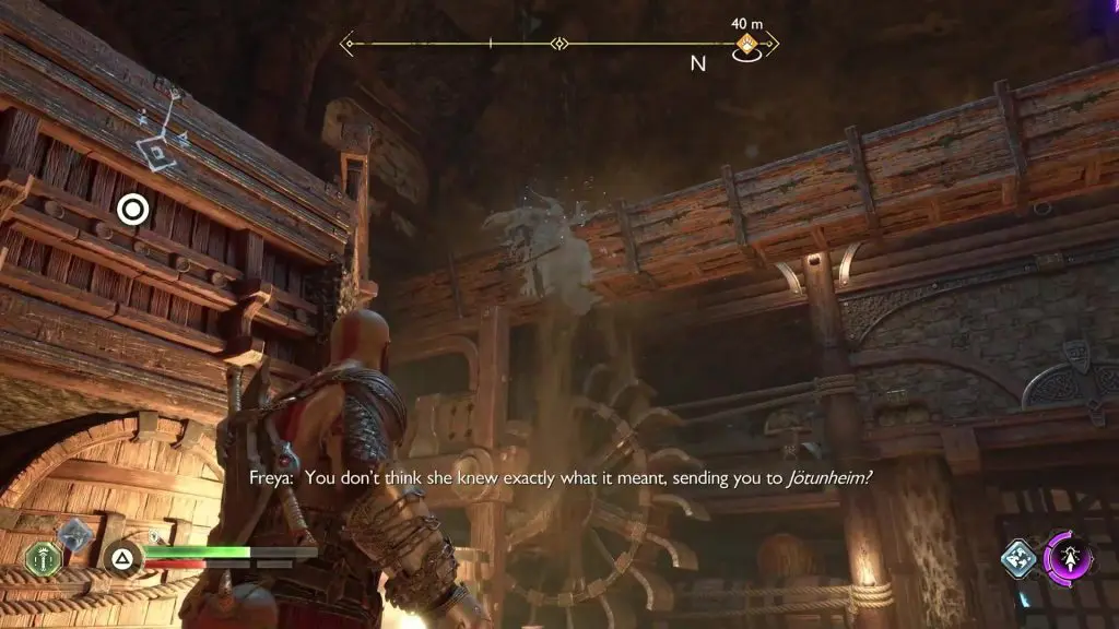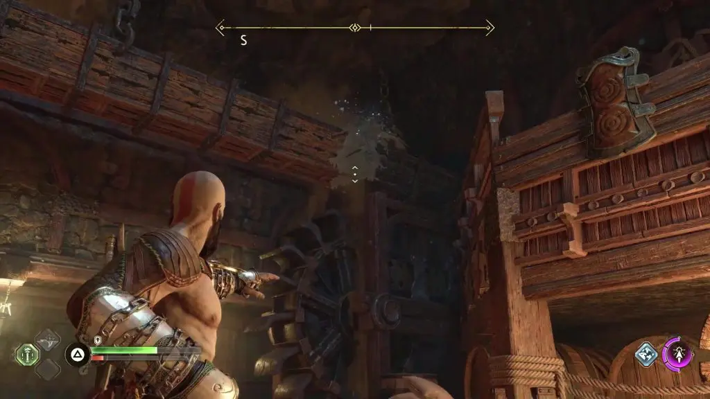 Climb up the staircase next to the Nornir Chest and proceed ahead until you reach a big room. Climb up the wall in this room as shown in the picture below. Rotate the lever above to move the wooden trough as shown in the second picture below.
