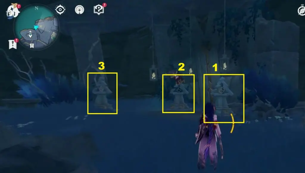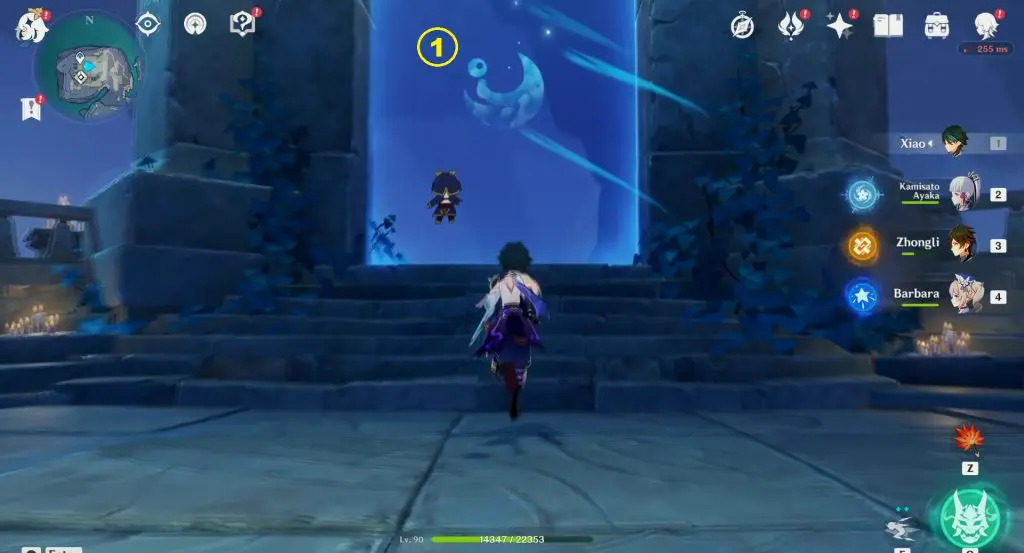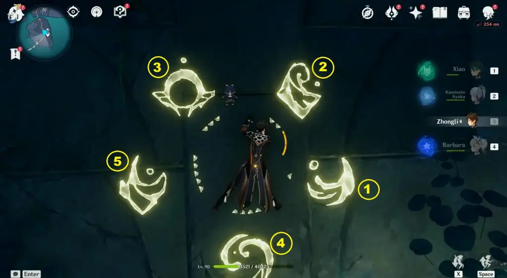 Here you will five barriers with the same symbols on them as you saw on the wall before. Run into the barrier in the same order as you saw before on the wall. Run into all 5 barriers in the correct order, and 3 Ruin Guards will spawn.