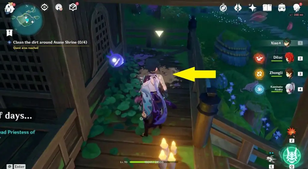 The first step is to complete the ‘Neko is a Cat: Offering Box’ World Quest. You will get the quest by talking to Neko in Asase Shrine (Location Shown Below). For the quest, you will have to clear the dirt around Asase Shrine. There will be 4 spots around the shrine as shown in the second picture below. Use Anemo or Hydro attack to clean the dirt. This will complete the quest.